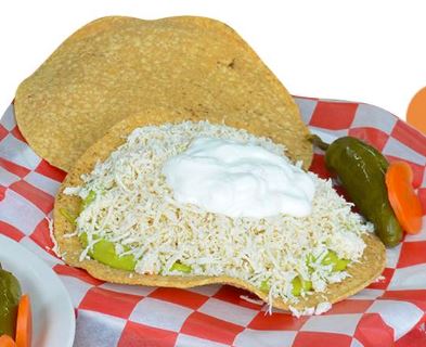Tostada 12 cm con frijoles, guiso, lechuga, crema, queso fresco y tomate.
