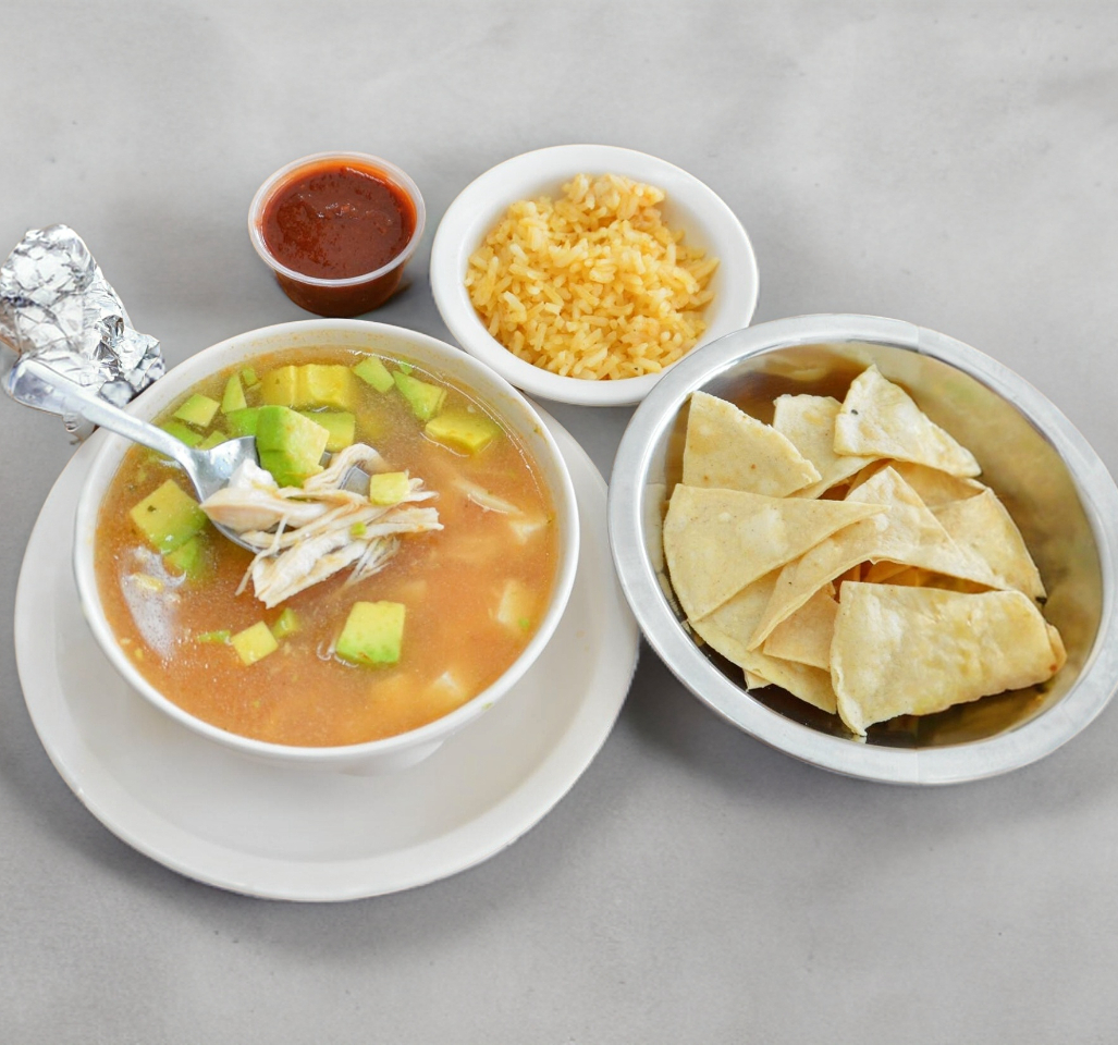 Caldo de pollo: Pollo desmenuzado con papa y zanahoria acompañado con arroz y tortillas.