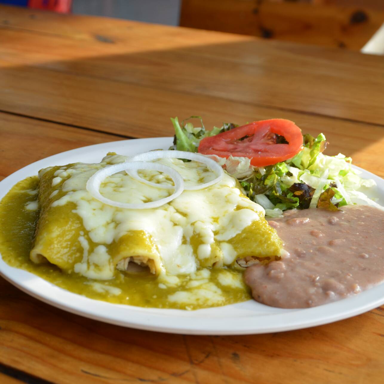 4 Tacos de pollo bañadas en salsa suiza. Gratinados con queso mozzarella acompañados de frijoles, lechuga y tomate.