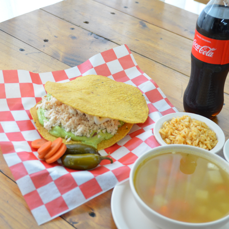 Tostada de Pollo Grande.*1 + Caldo de Pollo*1 + Refrescos Varios Sabores*1