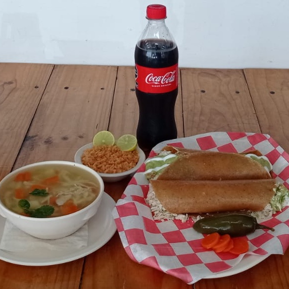 Taco de Pollo Grande.*2 + Caldo de Pollo*1 + Refrescos Varios Sabores*1