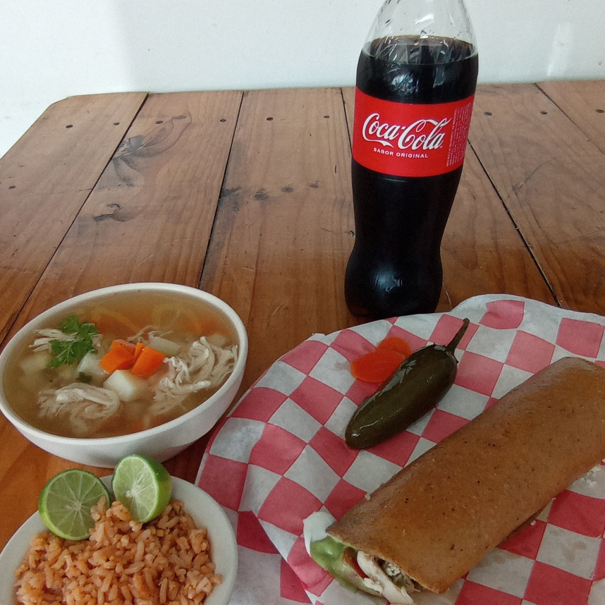 Taco de Pollo Grande.*1 + Caldo de Pollo*1 + Refrescos Varios Sabores*1