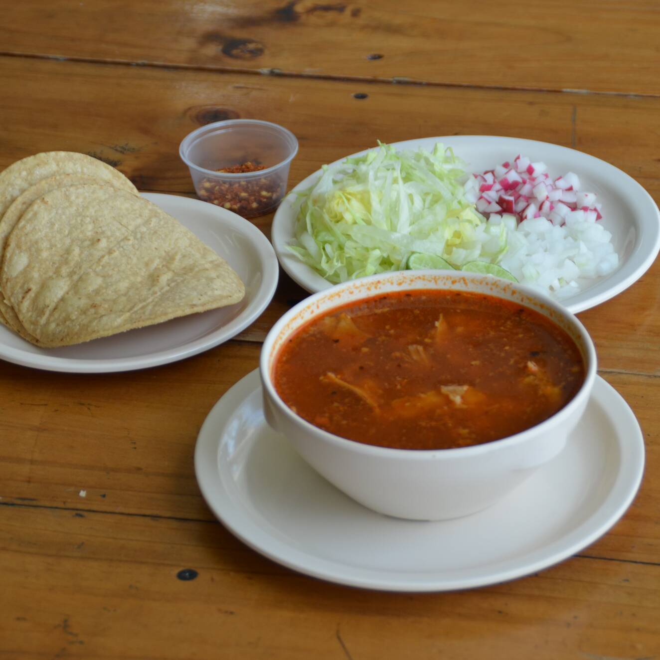 Pozole de Pollo, Puerco o Mixto en salsa de chile colorado acompañado de lechuga, rábano, cebolla, limón y tostadas.