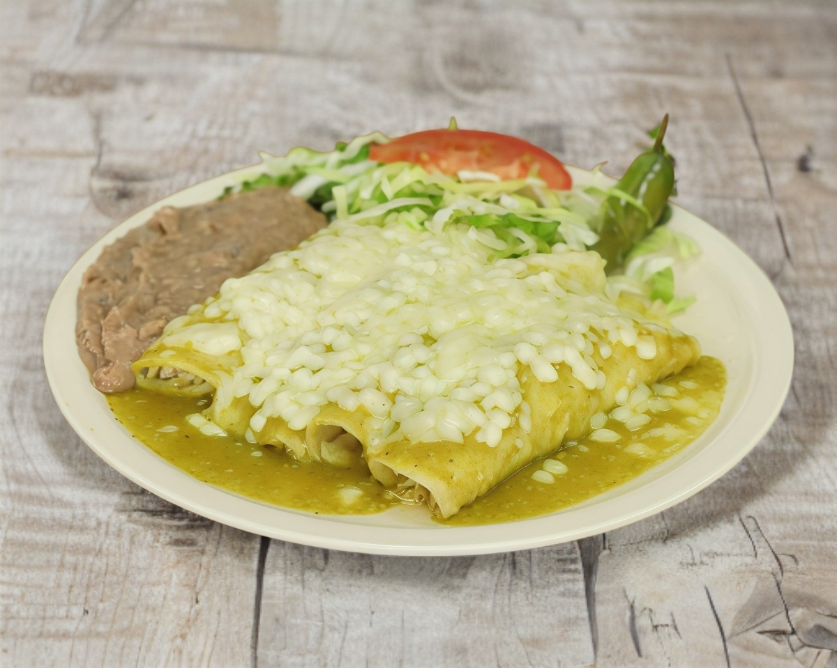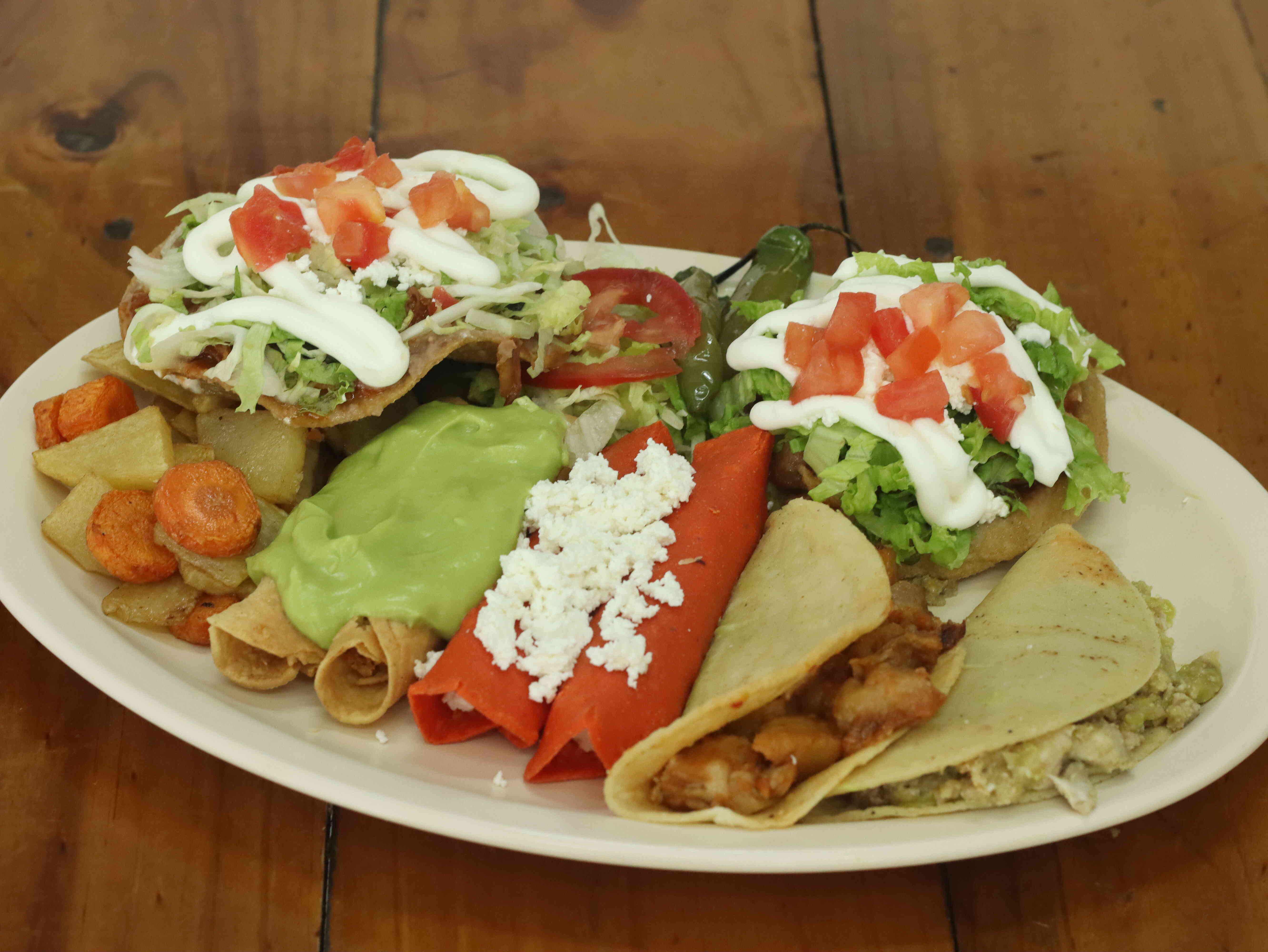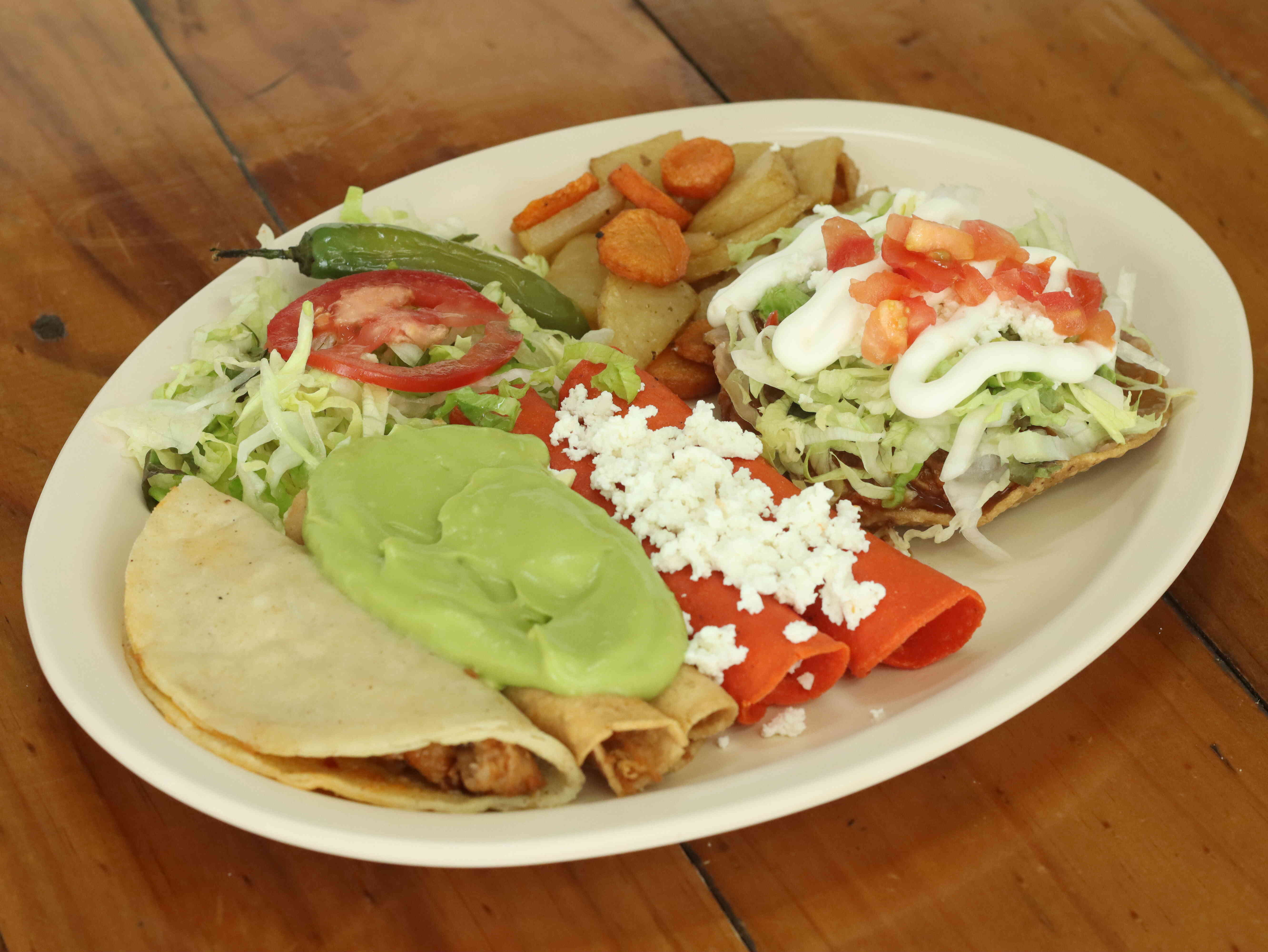 2 enchiladas rojas, 2 tacos dorados bañados en salsa de aguacate, 1 tostada con un guiso, 1 taco suave con guiso.