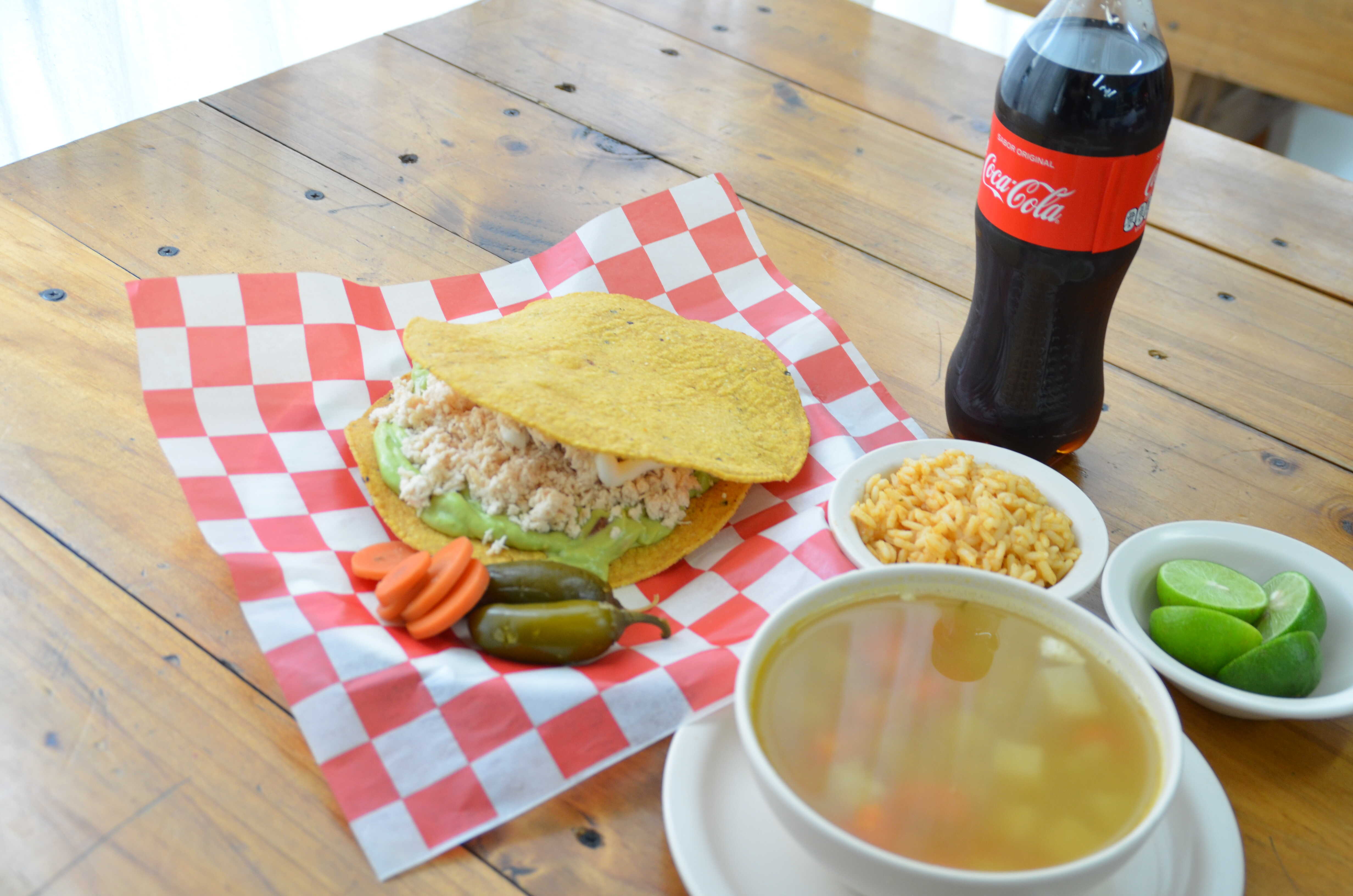 Tostada de Pollo Grande*1 + Caldo de Pollo*1 + Refresco de 600 Ml.*1