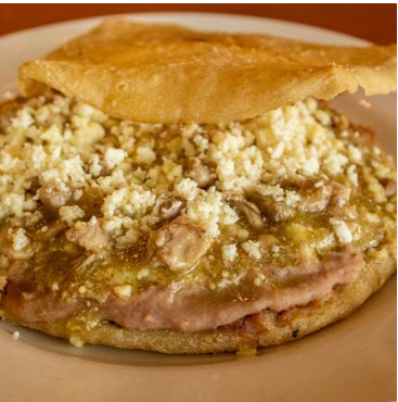 Pollo, queso ó guisos de carne de puerco.