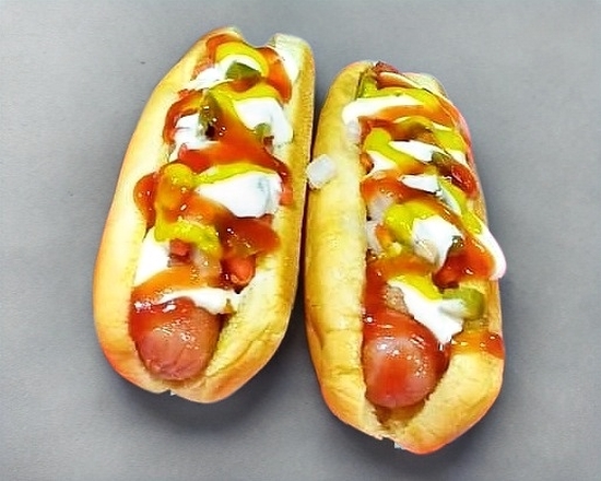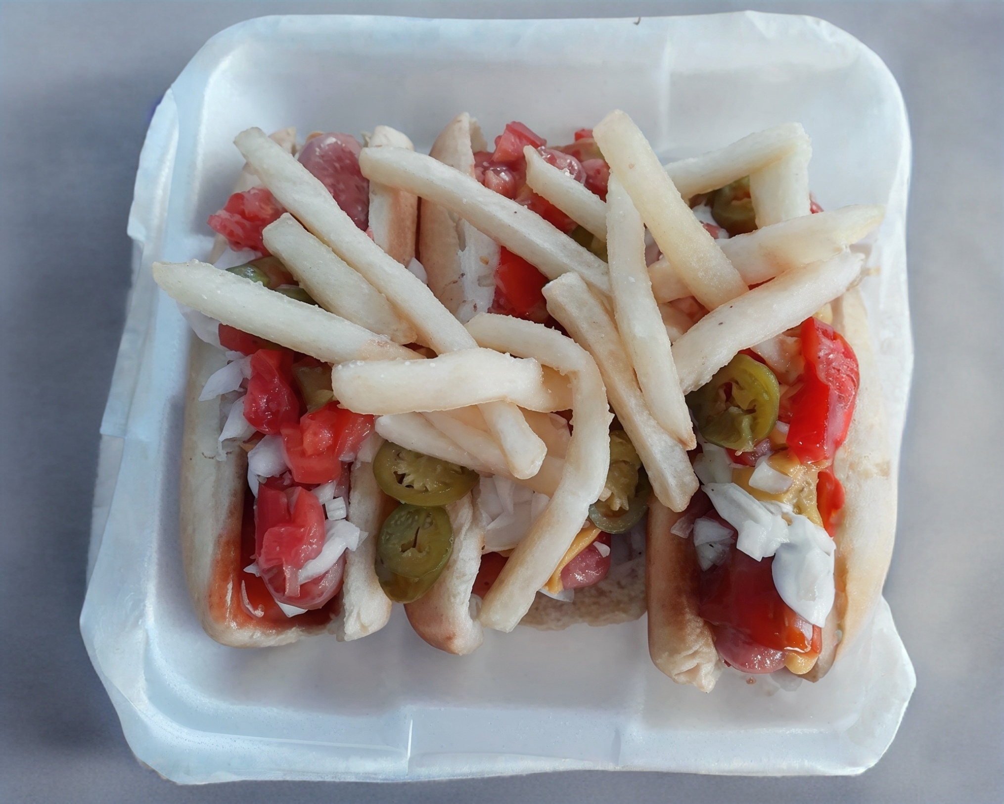 2 Salchichas, mayonesa, catsup, mostaza, tomate, cebolla, chile y papas.