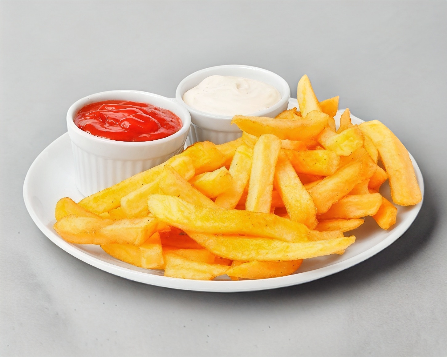 Papas francesas, acompañadas de queso amarillo y catsup.
