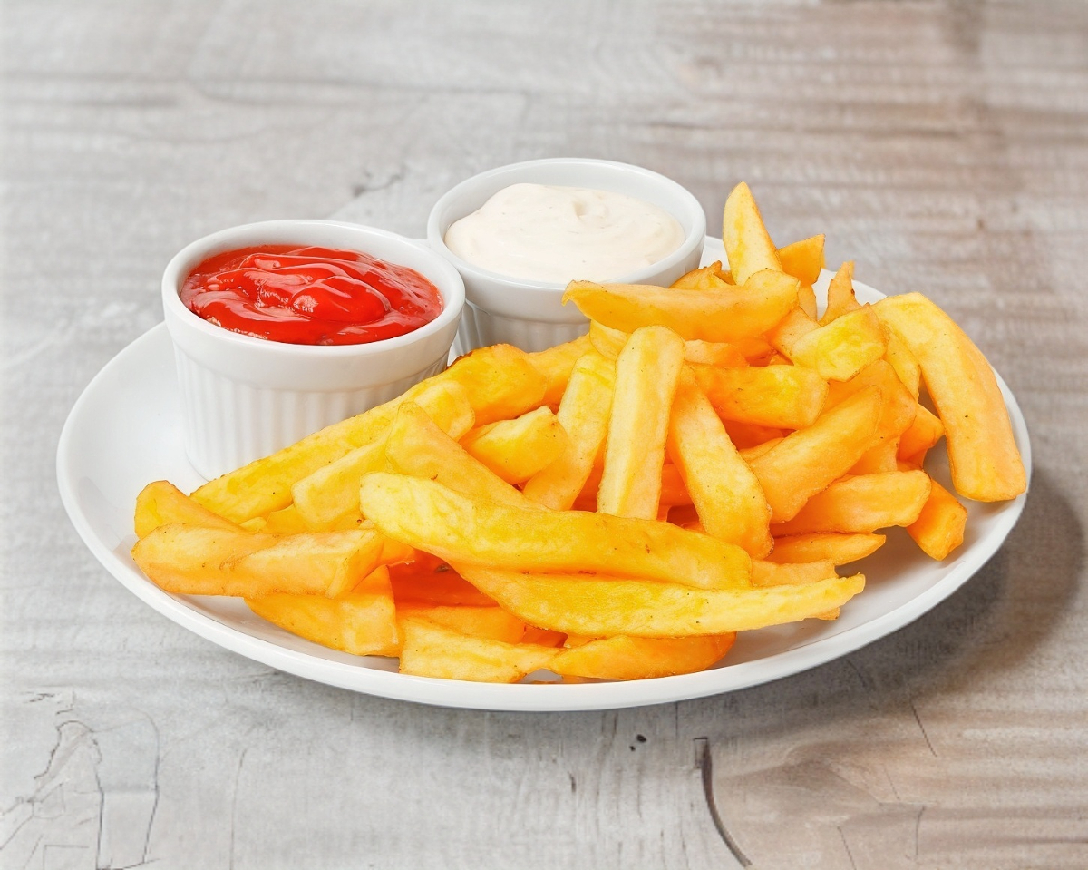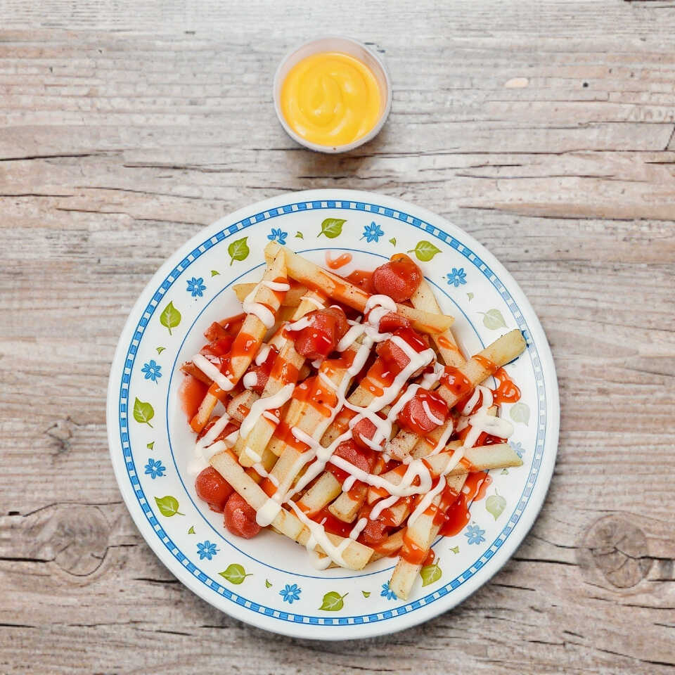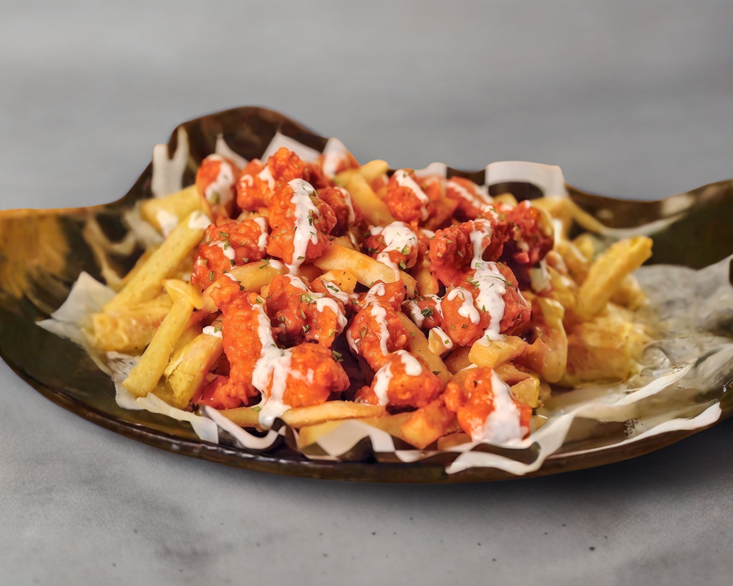 Crujientes papas francesas con boneles, con queso amarillo y salsa de tu preferencia