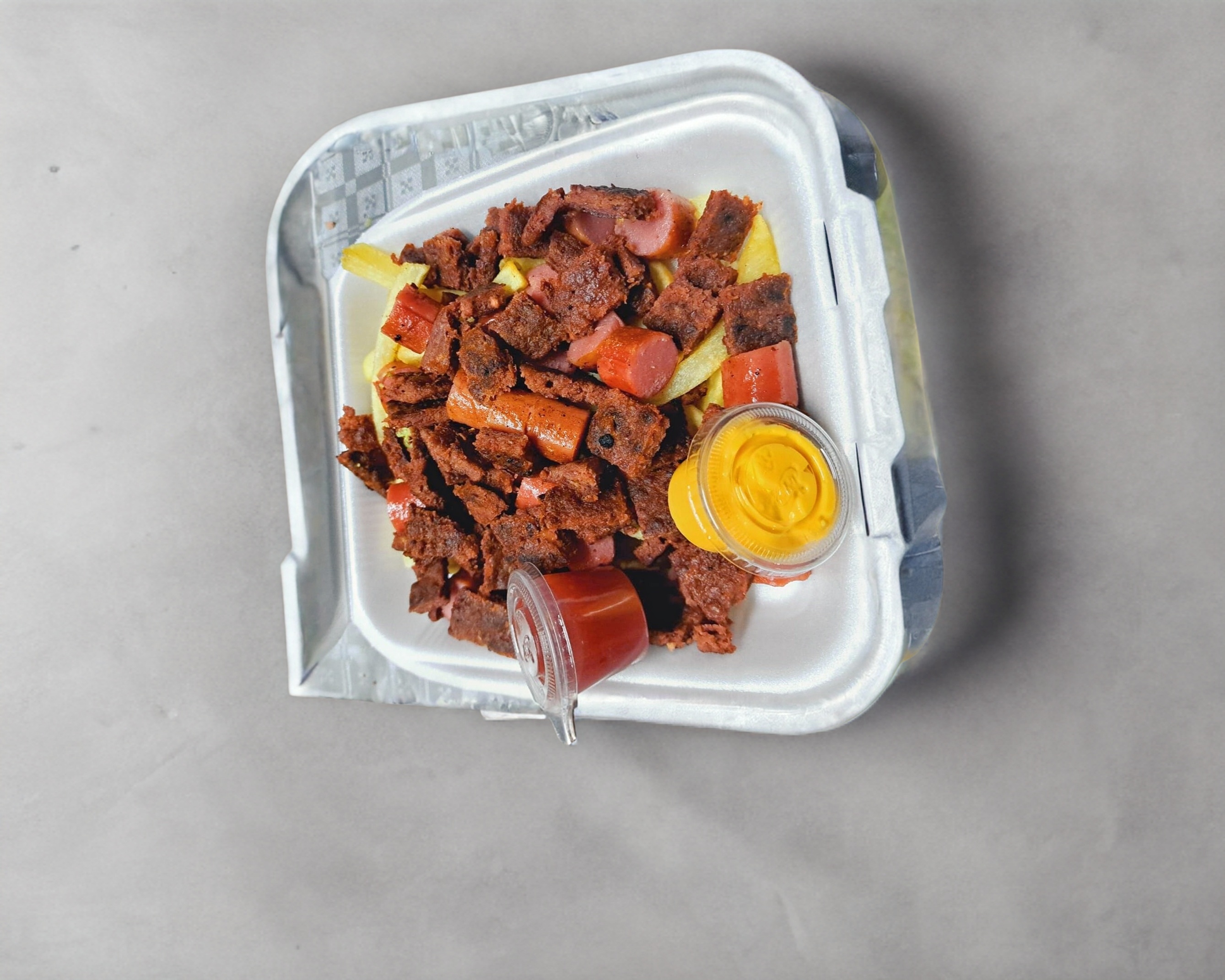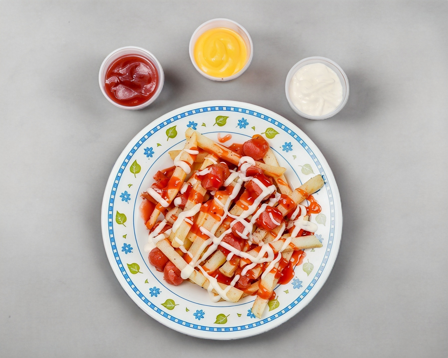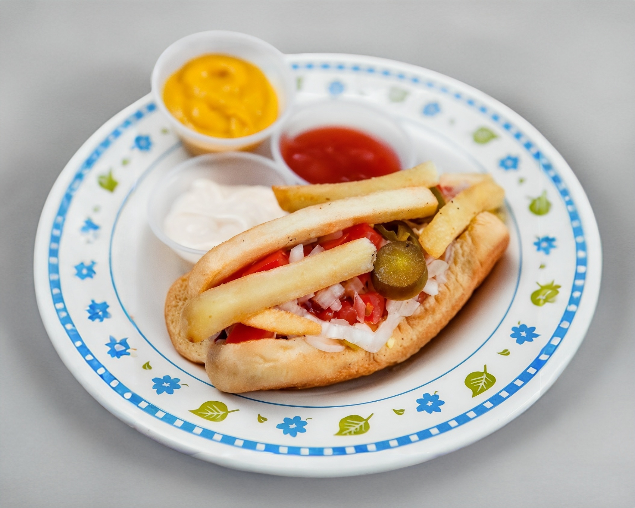 1 Salchicha, mayonesa, catsup, mostaza, cebolla, tomate, chile y papas.