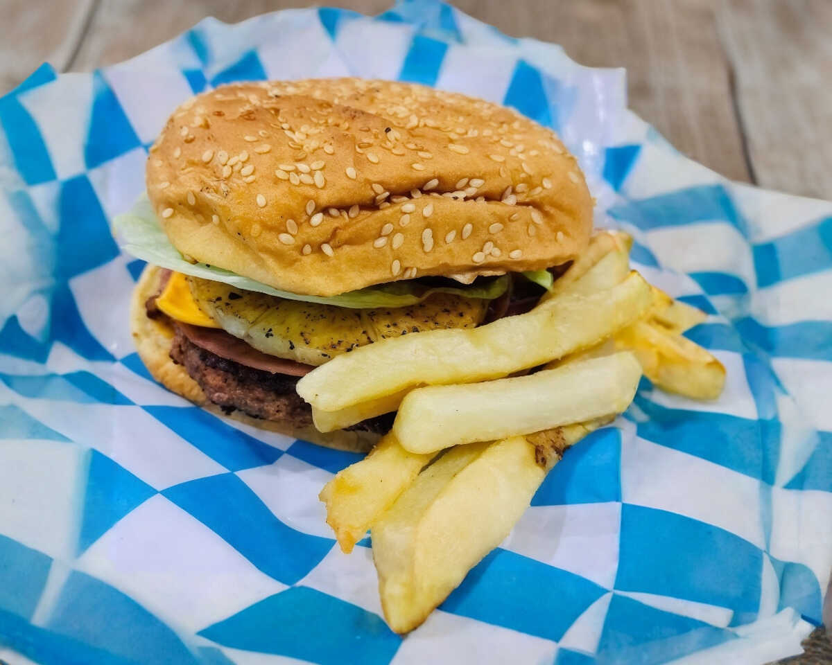 Carnal de sirlon, piña, jamón, queso amarillo, mayonesa, catsup, lechuga, tomate, cebolla, aguacate, y papas a la francesa.