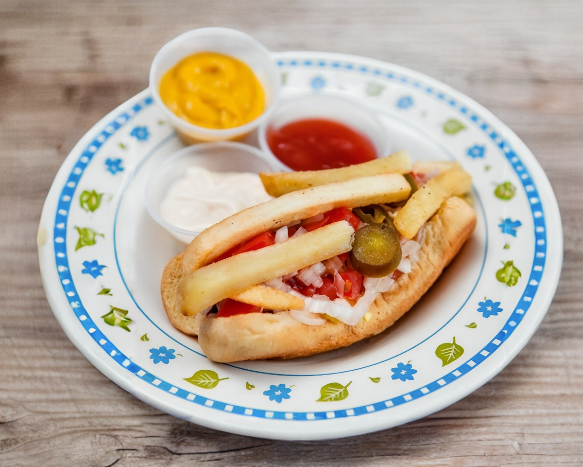 Salchicha jumbo ,tómate, cebolla, mayonesa, catsup,jalapeños ,papas fritas