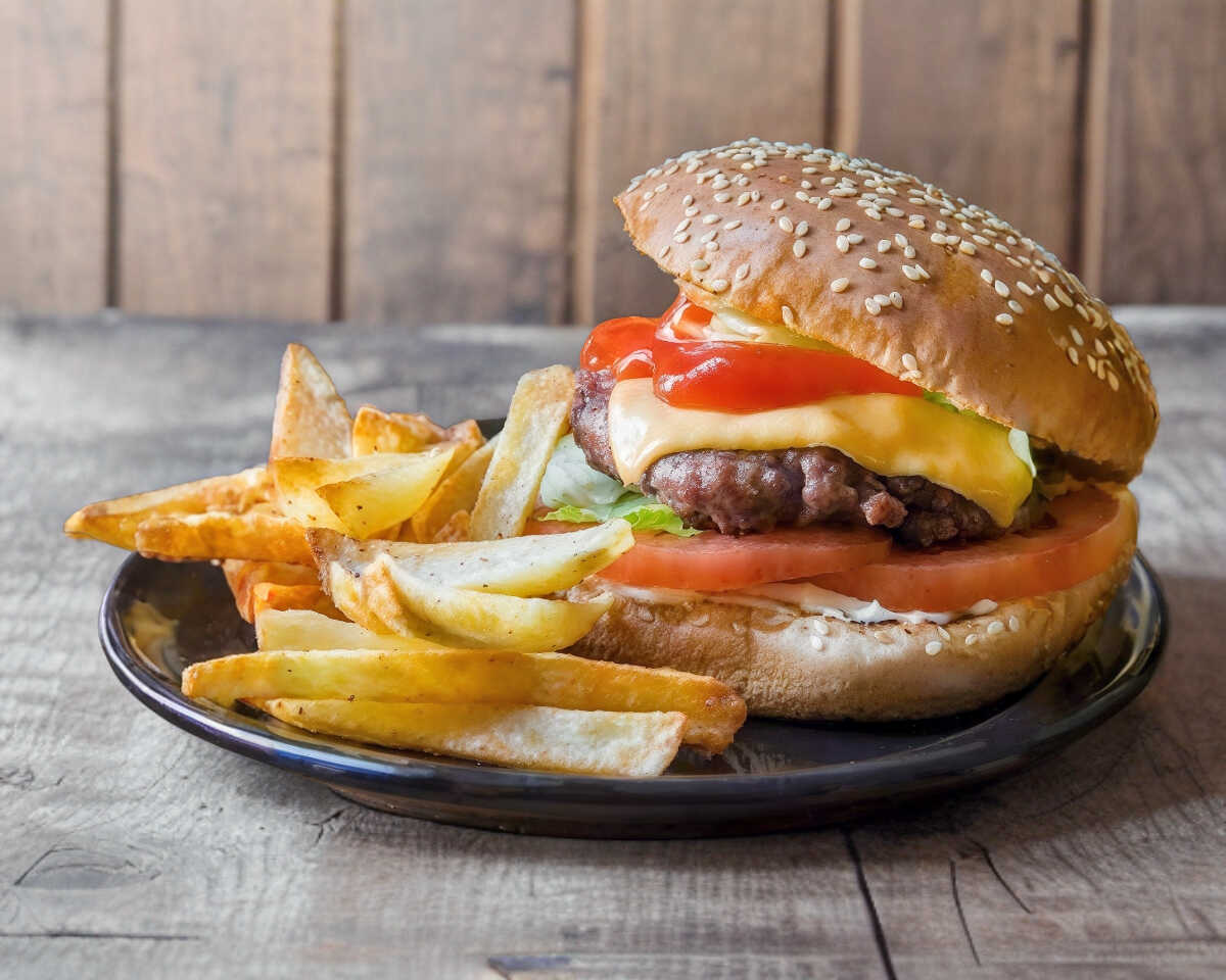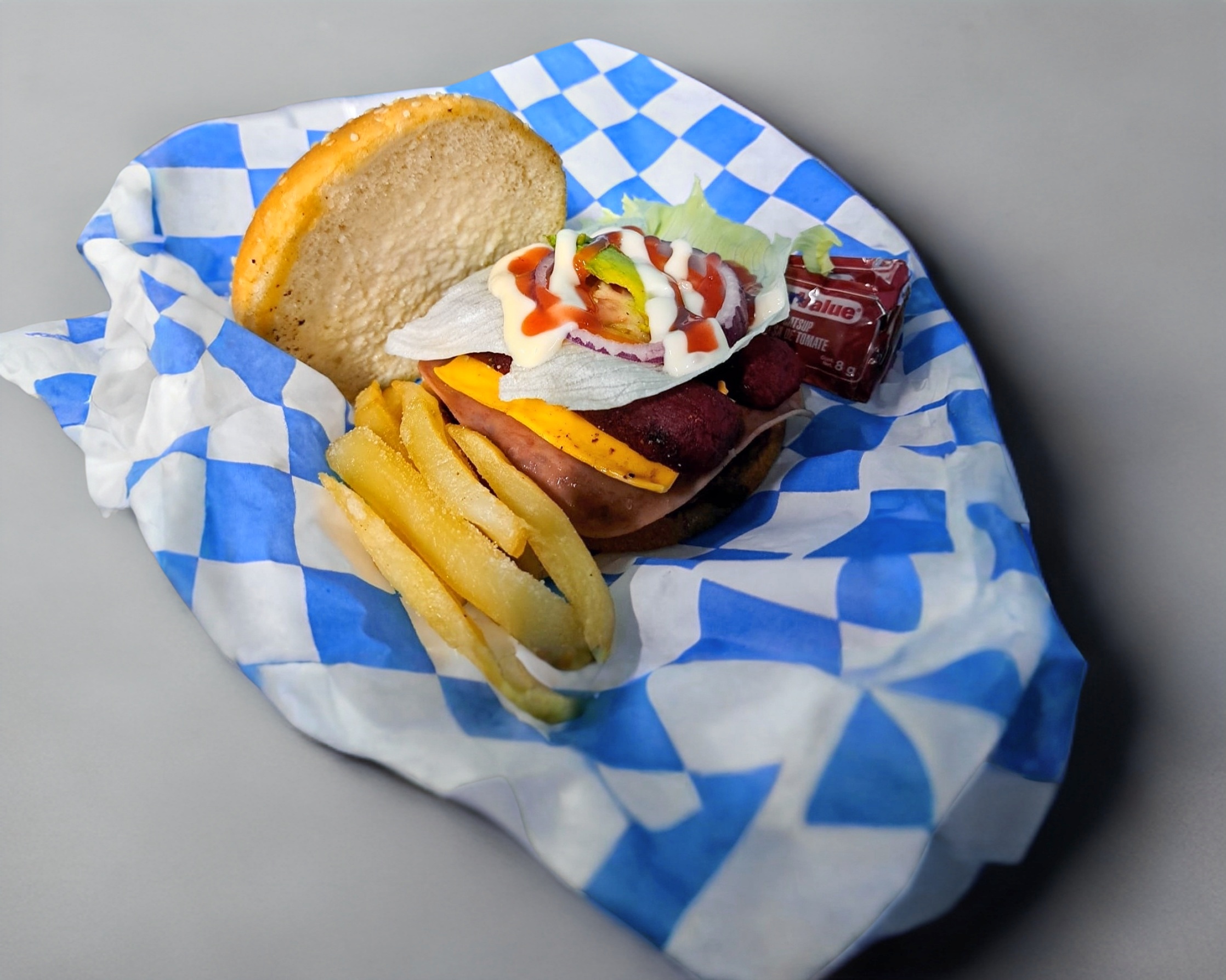 Carne de res ,jamón, queso amarillo, lechuga, tomate, cebolla, mayonesa, catsup y papas francesa