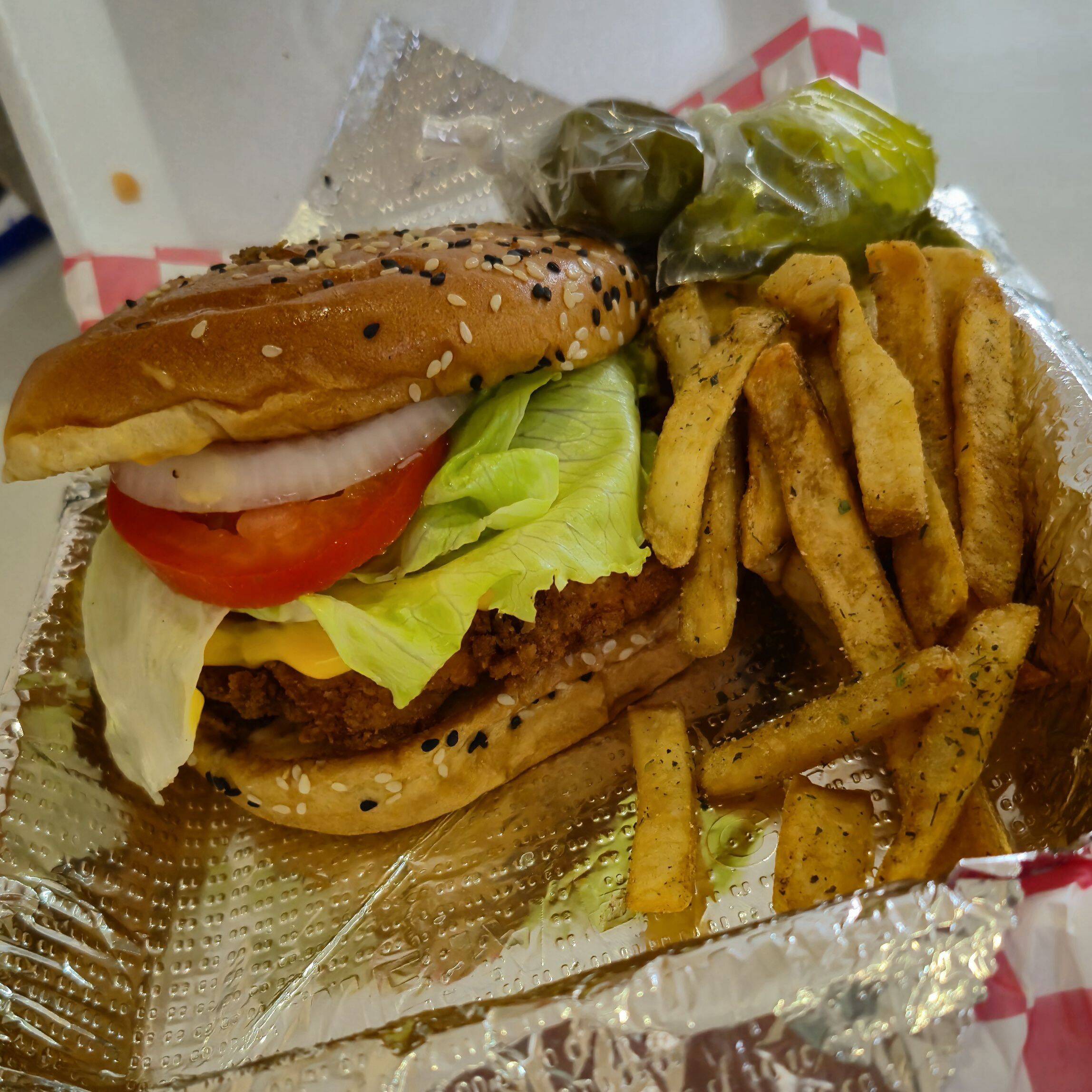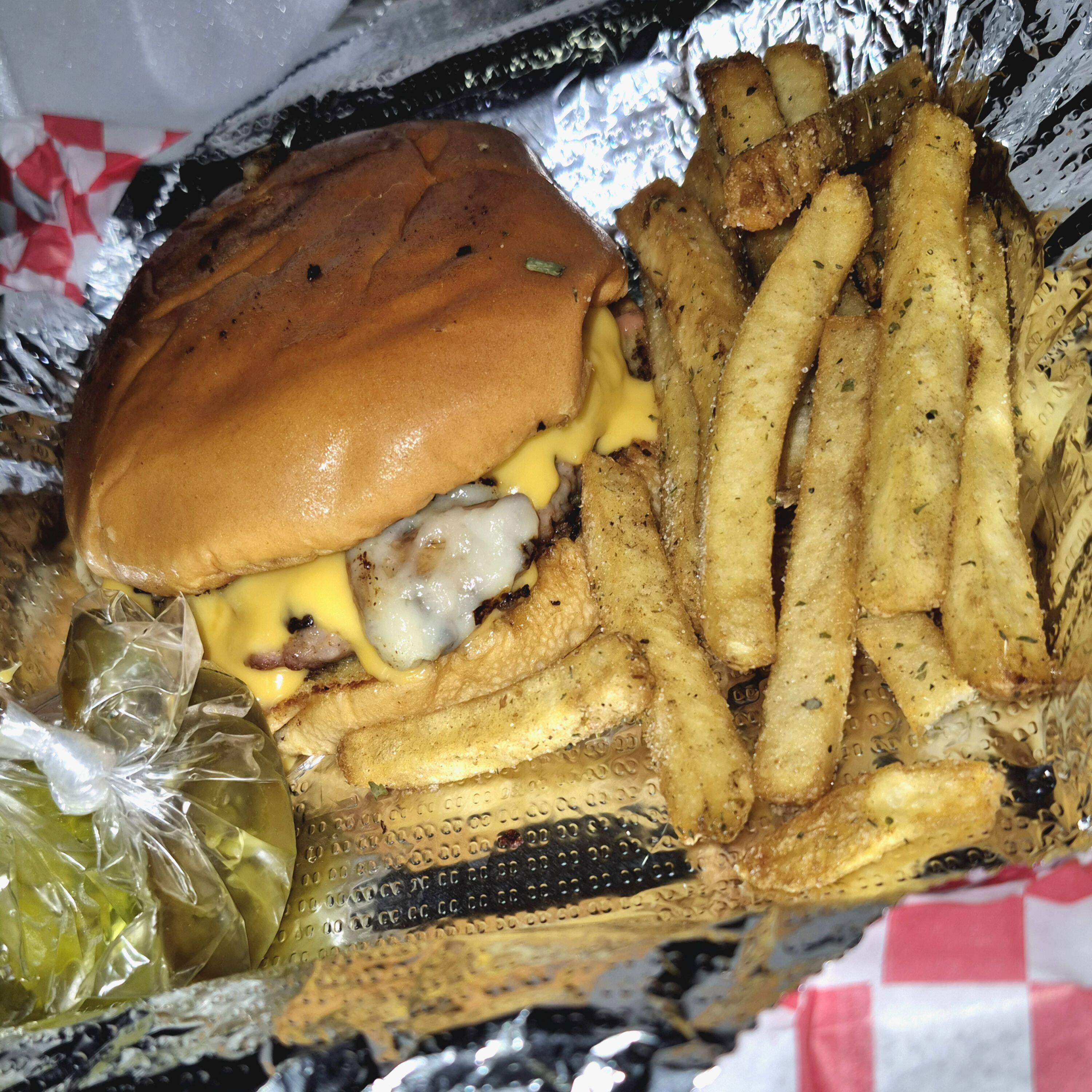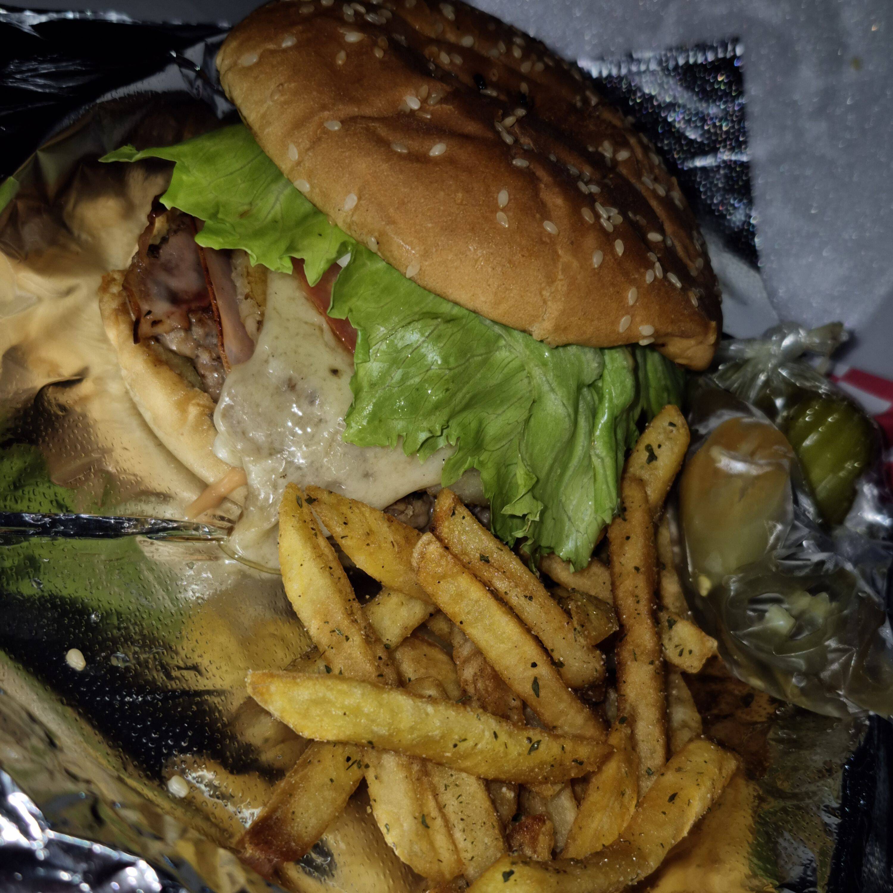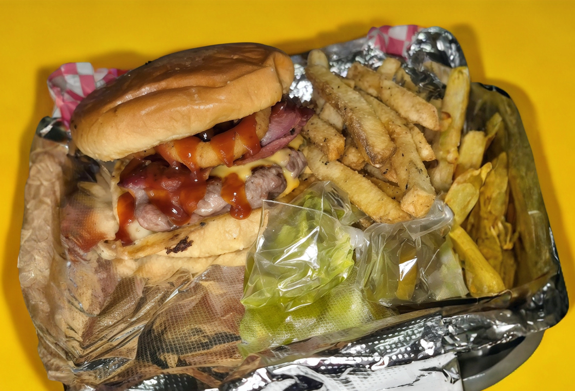 Pan brioche, carne, pollo/res, queso amarillo, 2 aros de cebolla, tocino, salsa BBQ, aderezos, porción de papas lisas y 1/2 L de té.