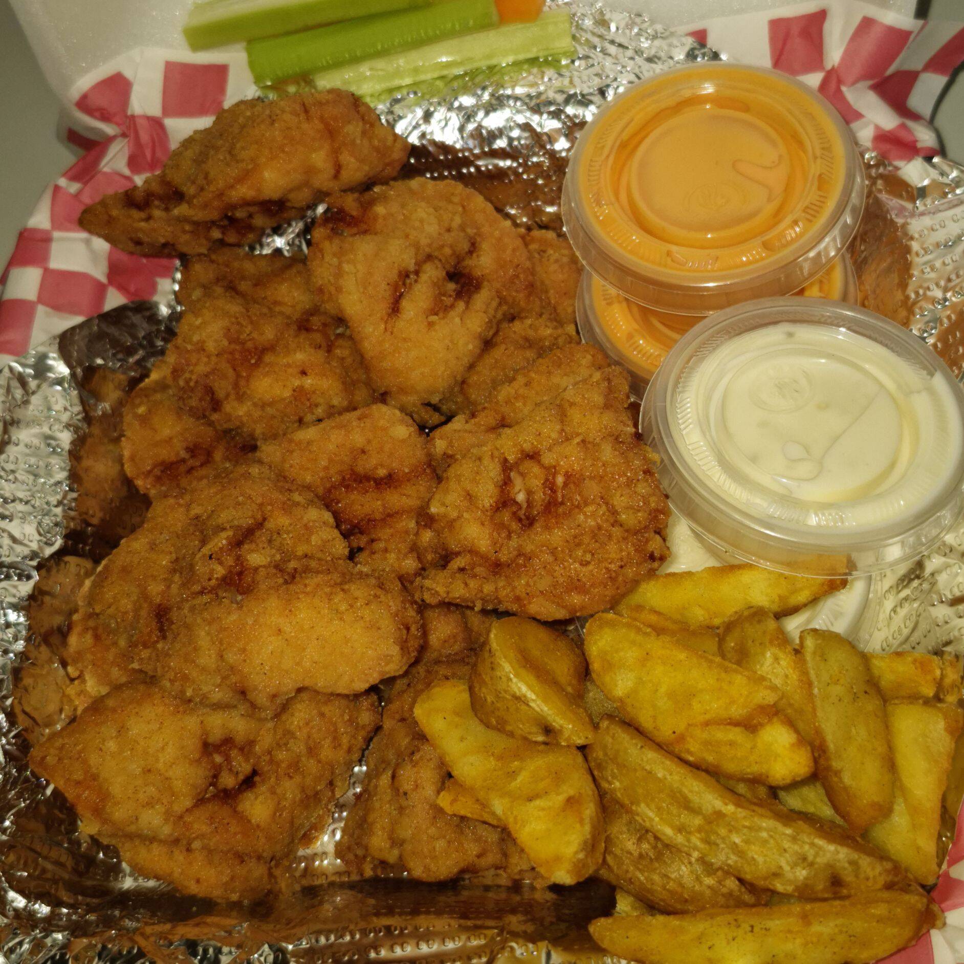 32 boneless, orden de papas, 2 L de té, 4 salsas, 4 aderezos rancho, apio y zanahoria.