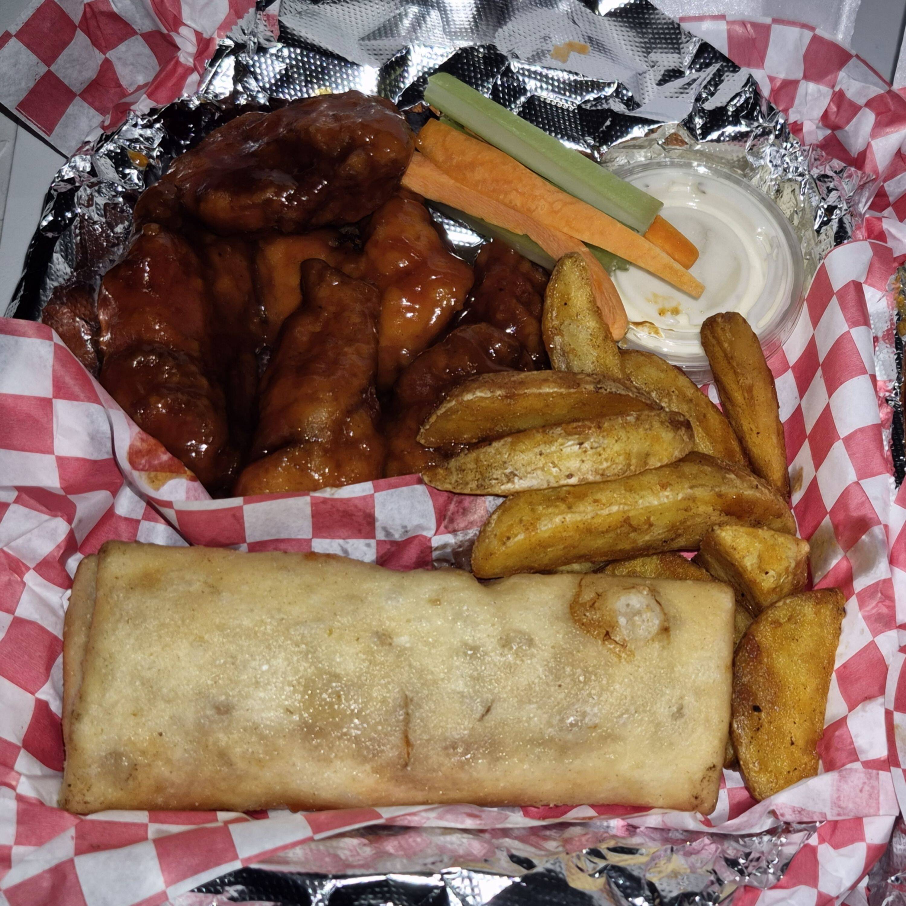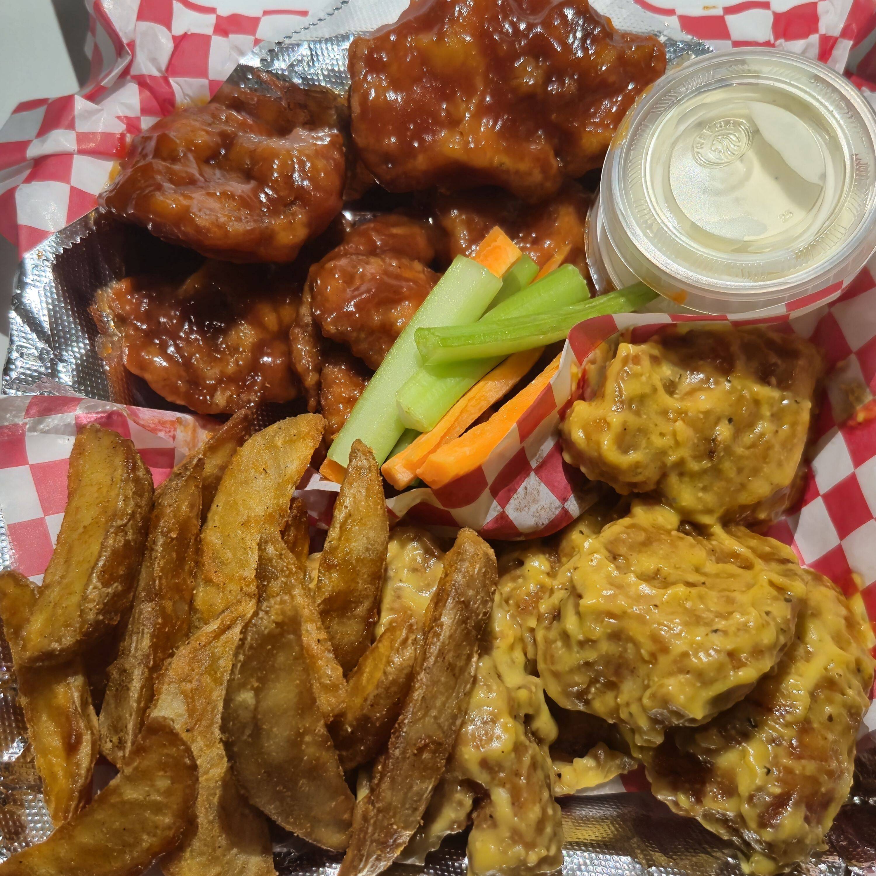 6 boneless, porción de papas, 1/2L té, 1 salsa, 1 aderezo, verdura y un burrito de frijoles. *costo extra de $4 si el burrito es de pizza.