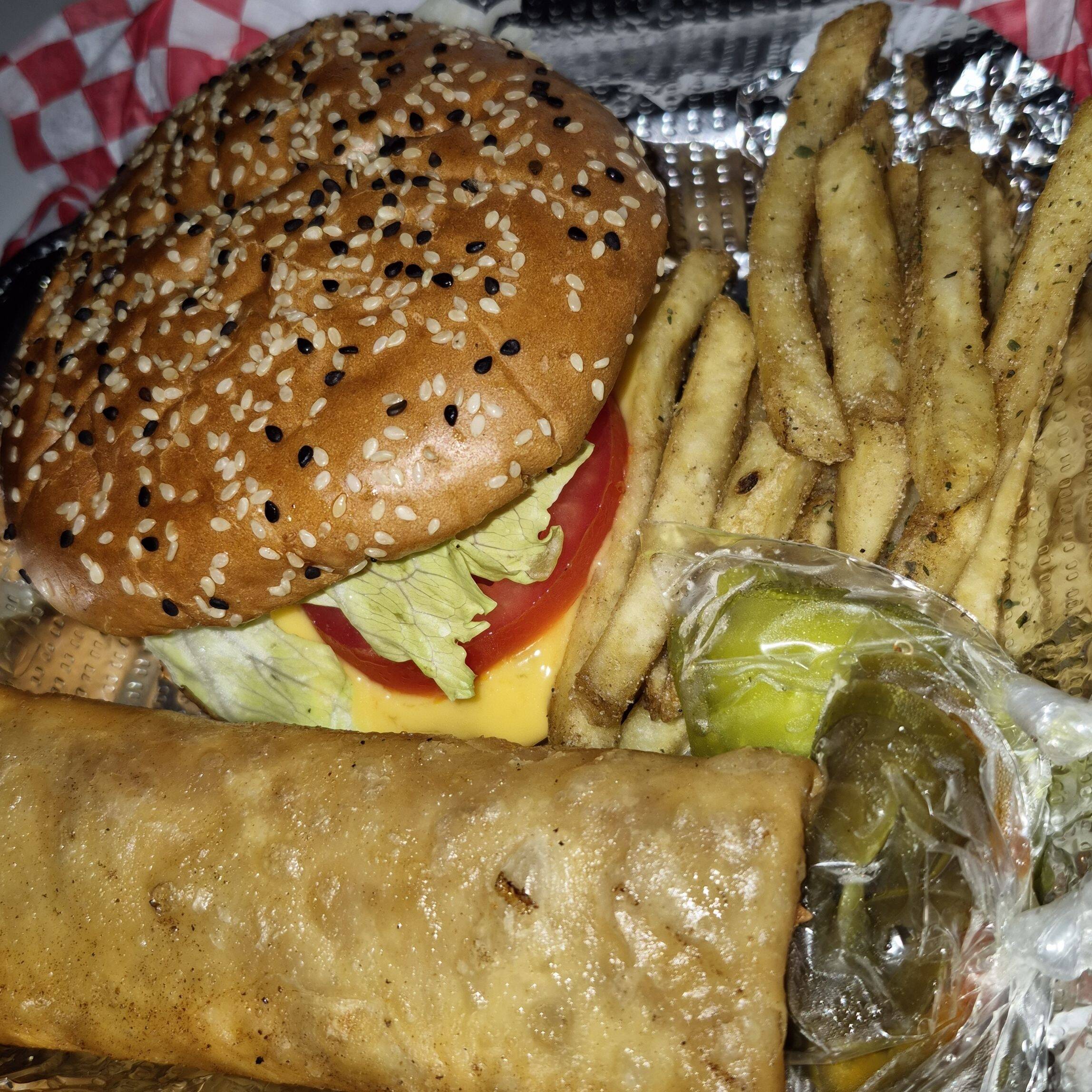 Pan, carne de res o pollo, queso amarillo, salsas, lechuga, tomate, cebolla, porción de papas, ½L de té y 4 boneless con una salsa.