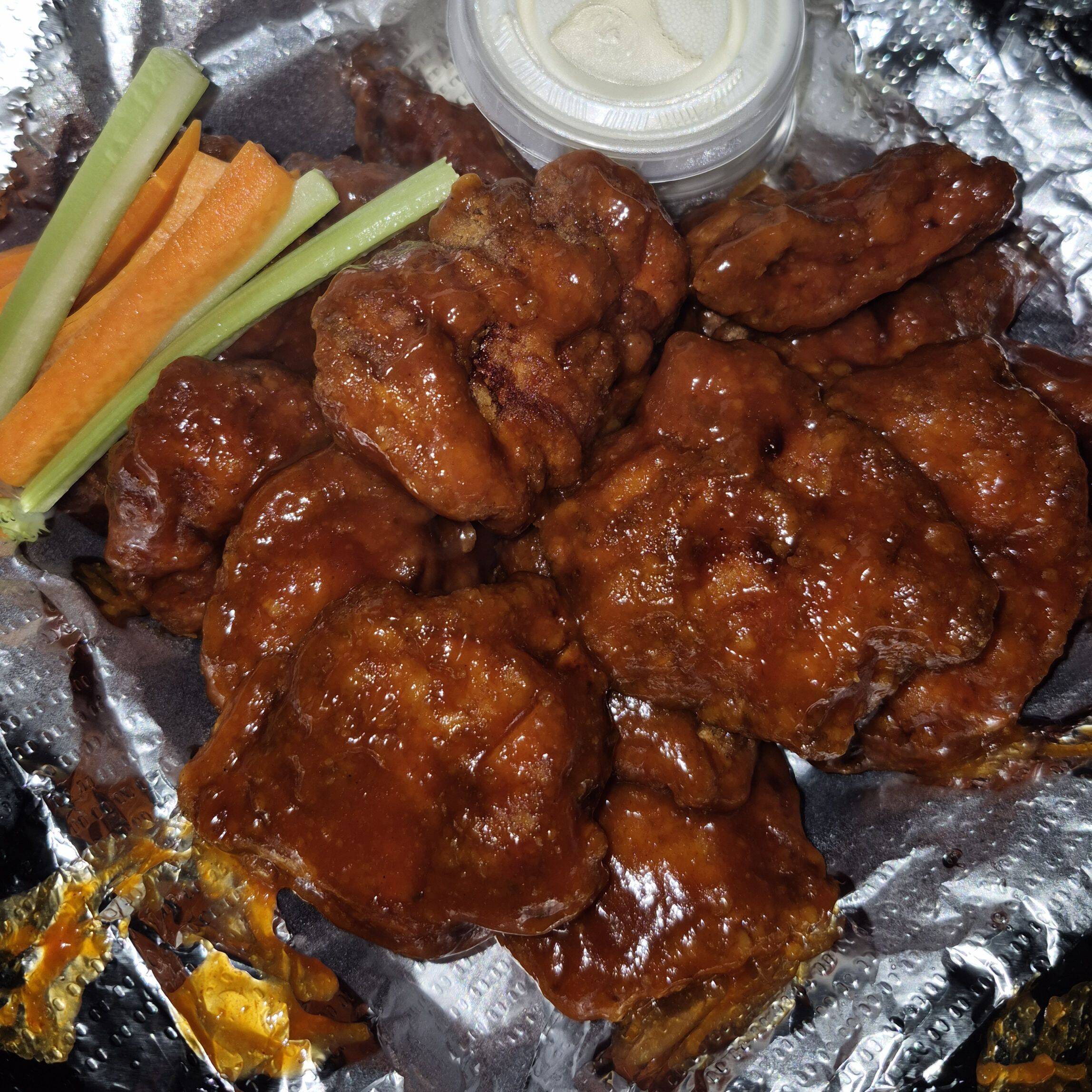 24 boneless, orden de papas, 2 L de té, 4 salsas, 4 aderezos rancho, apio y zanahoria.