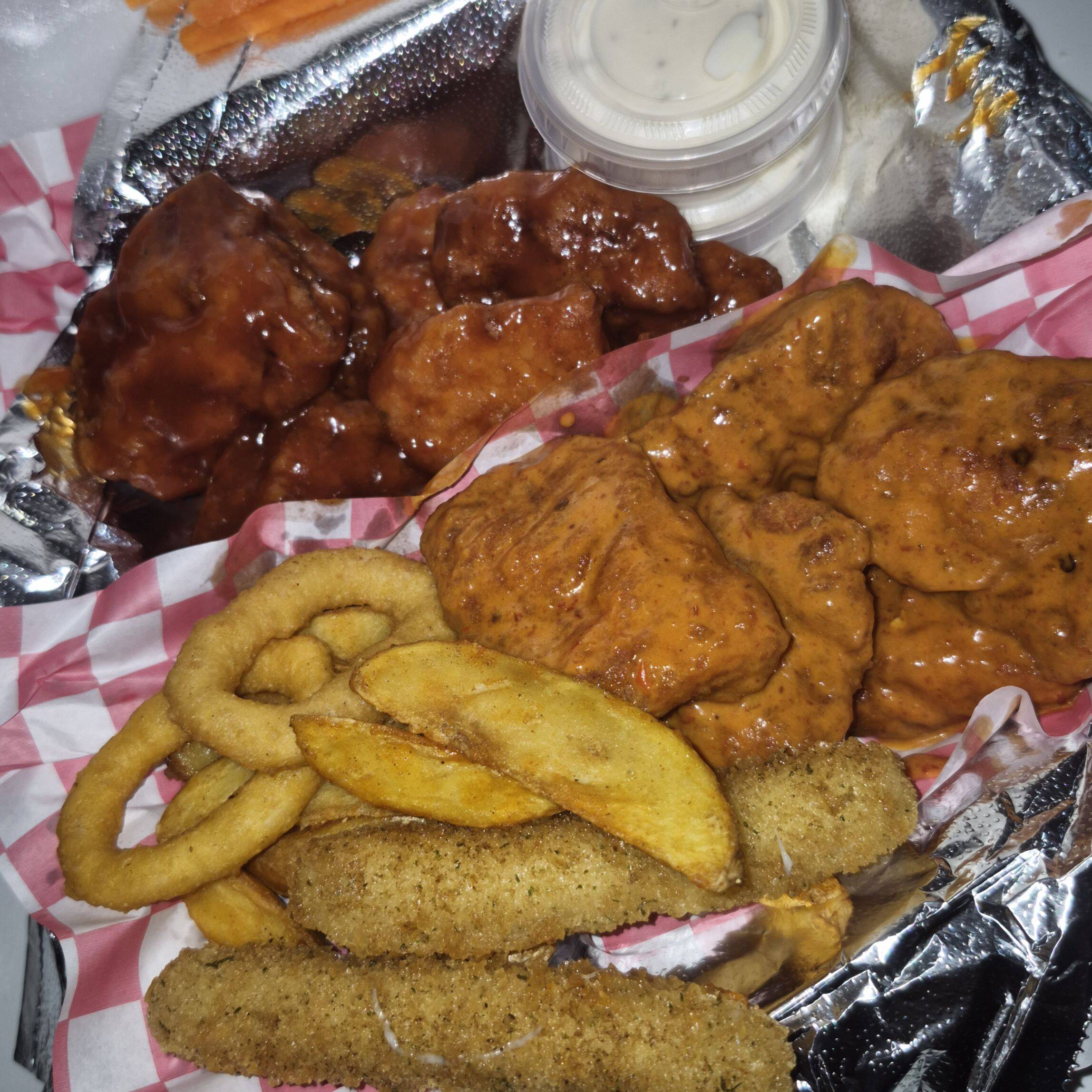 12 boneless, porción de papas, 2 aros de cebolla, 2 dedos de queso, 1 L de té, 2 salsas, 2 aderezos rancho, apio y zanahoria.