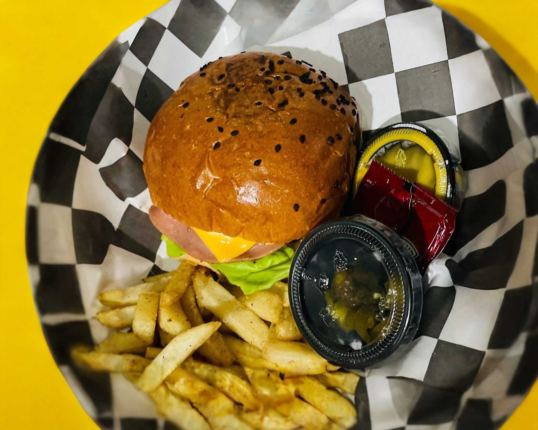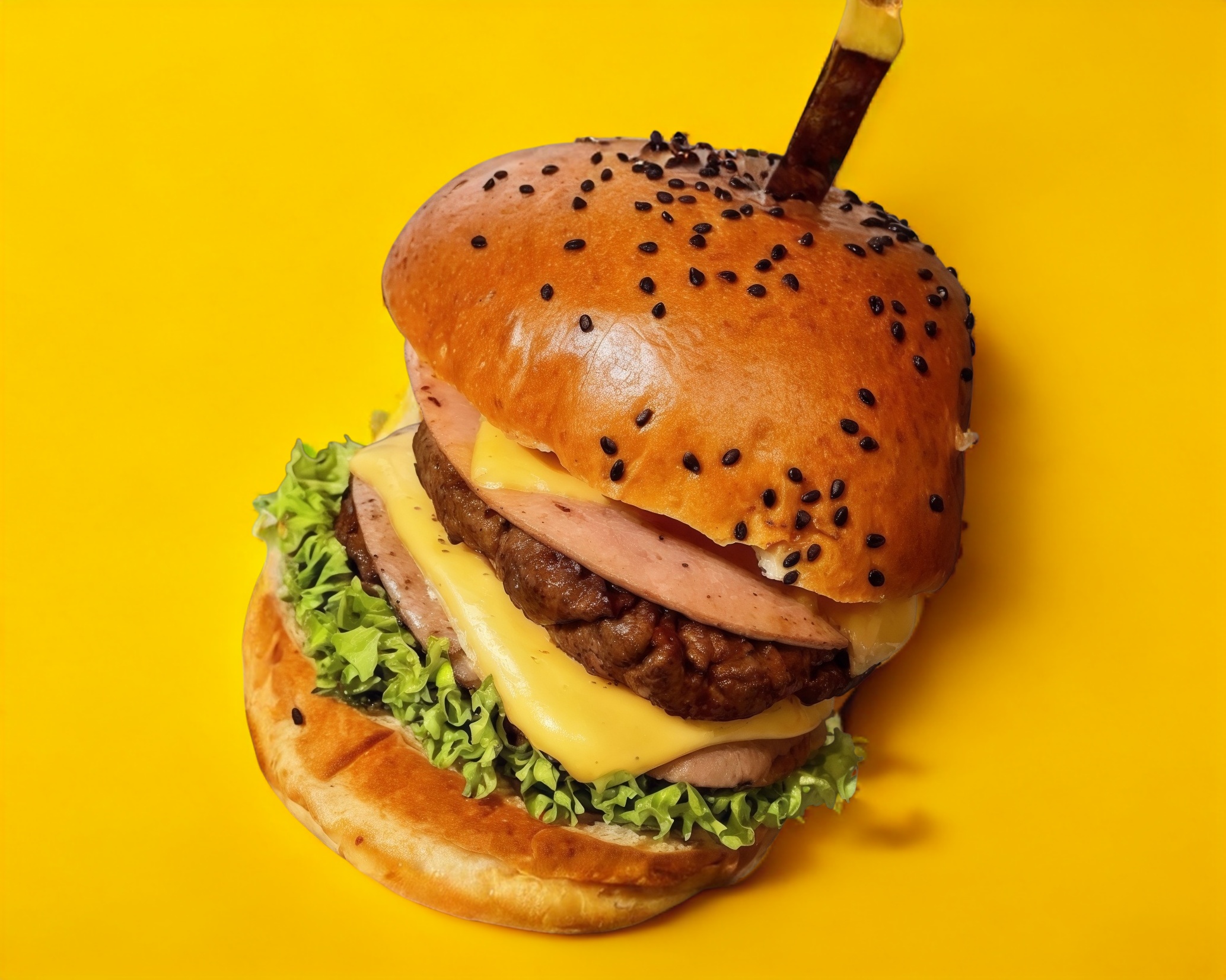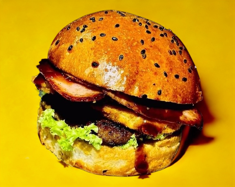 Doble carne de res de la casa, doble queso, doble jamón, tomate, lechuga y aguacate.