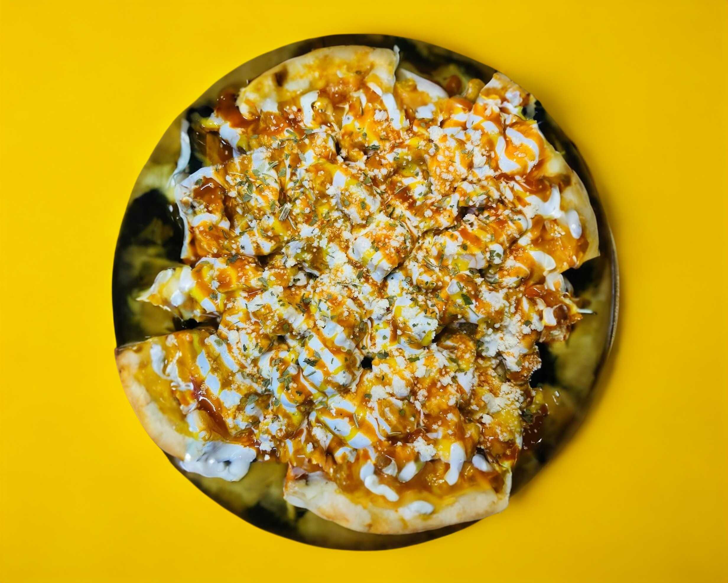 Papas gajo, trocitos de boneless, queso cheddar, aderezo ranch y salsa de su eleccion.