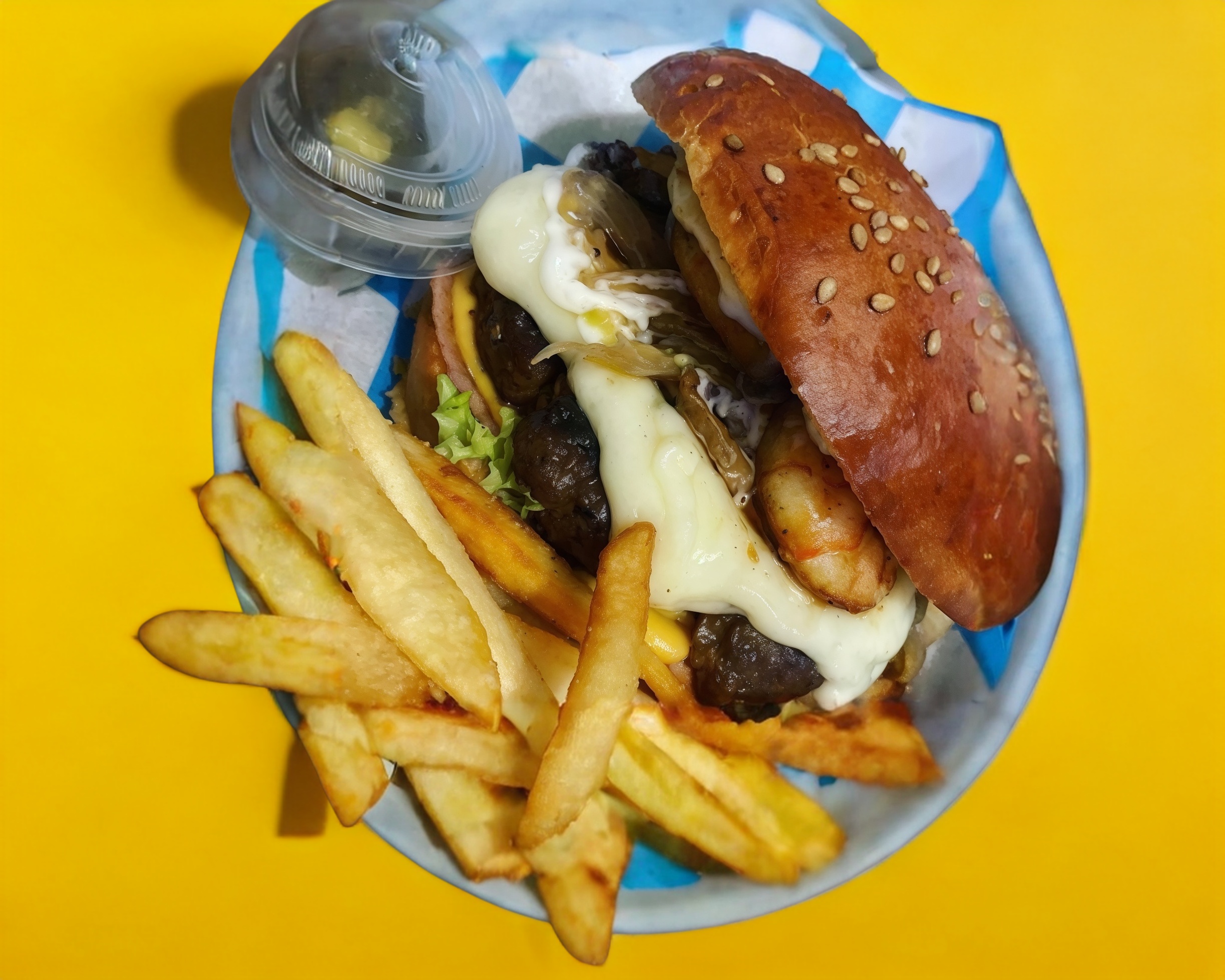Hotdog con salchicha de pavo, acompañado con cremas de la casa, queso gratinado, champiñones y cebolla caramelizada. incluyen: papas a la francesa.