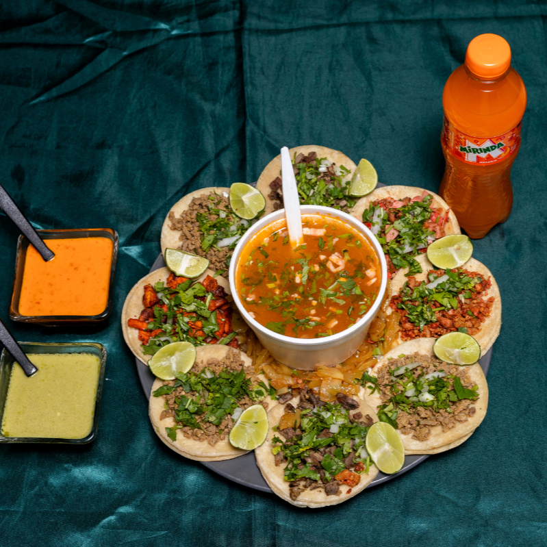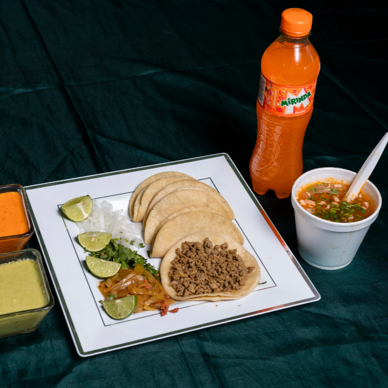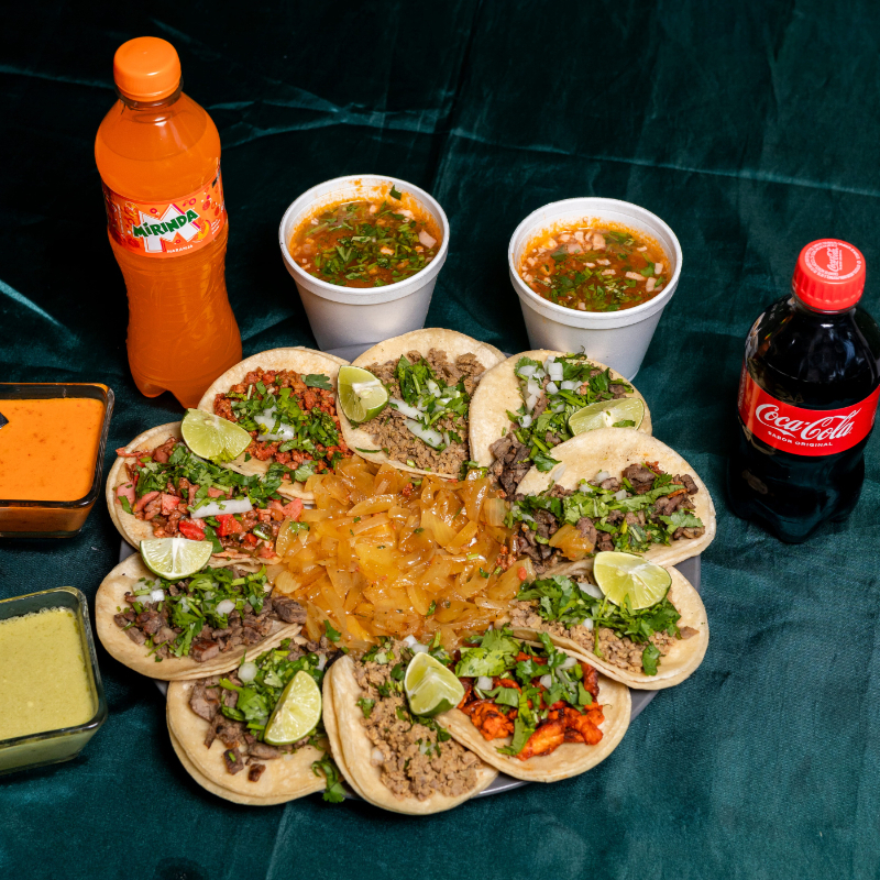 10 tacos de maiz en tortilla de maiz doble, 2 vasos de frijoles charros de 250ml y 2 refrecos de sabor