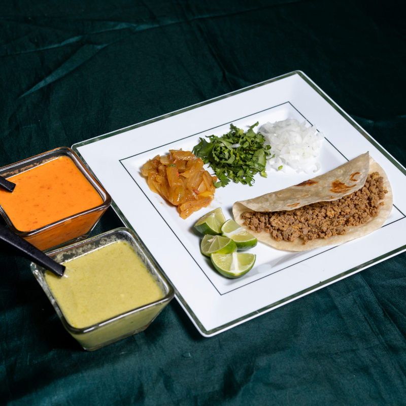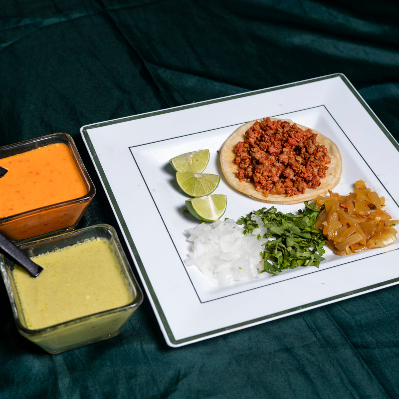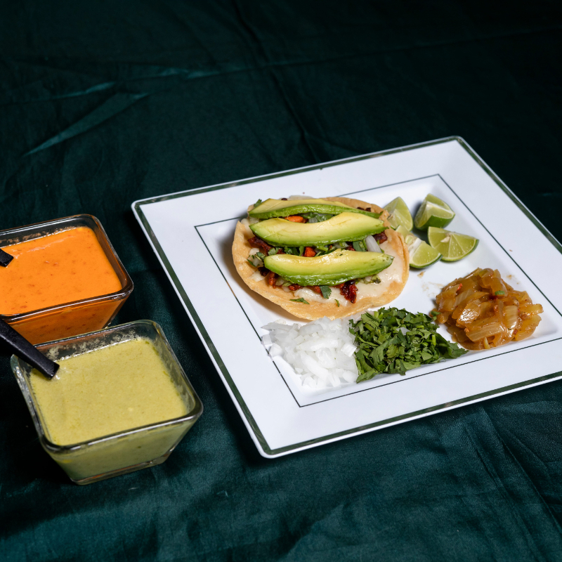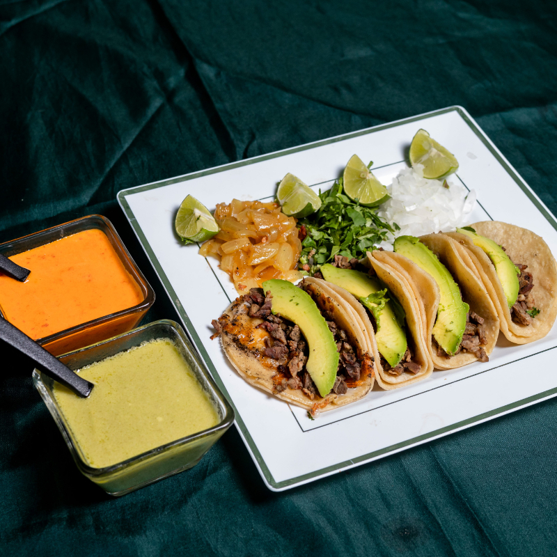 Tacos en tortilla de maiz doble con una costra de queso, aguacate a elección, y proteina a eleccion