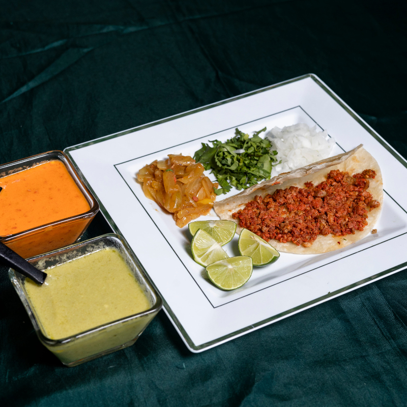 Tortilla de maíz con carne de res y chorizo de puerco.