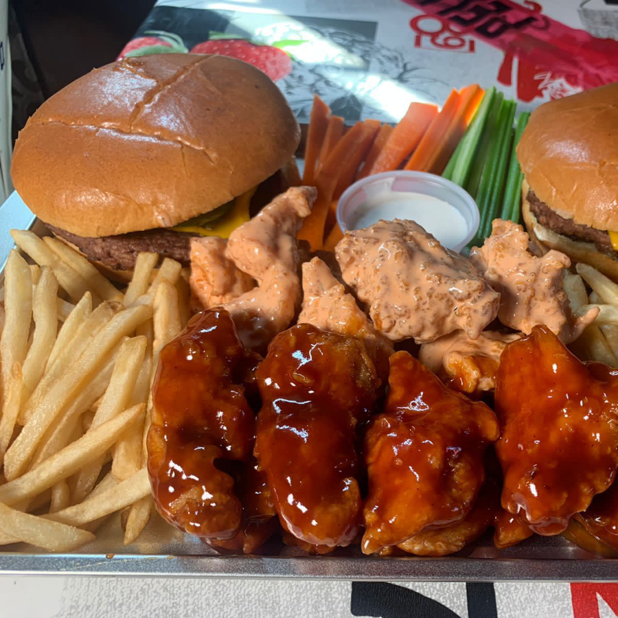 Hamburguesa Sencilla.*2 + Media Orden de Papas*1 + 12 Boneless*1