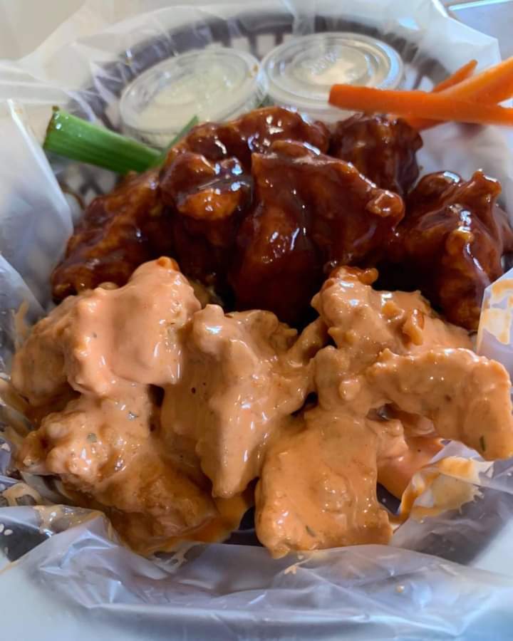 20 Jugosos boneless entre 2 salsas a elegir, apio, aderezo y zanahoria.