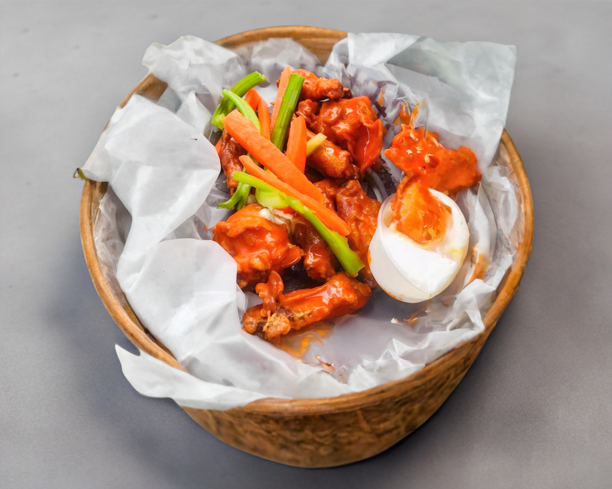 4 Alitas con 1 salsa a elegir, apio, aderezo y zanahoria.