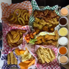 30 jugosos boneless (3 salsas a elegir) + 1/2 Orden de Papas + apio + aderezo + zanahoria