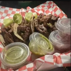 Deliciosa carne de arrachera, pídela a tu gusto con mayonesa, mostaza y cátsup. Porción de papas, 120 aproximadamente.