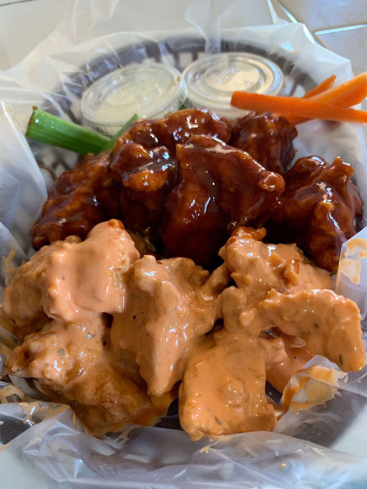 10 boeneless bañados en una salsa 1 aderezo ranch si se escogen 2 se bañara en la primera
