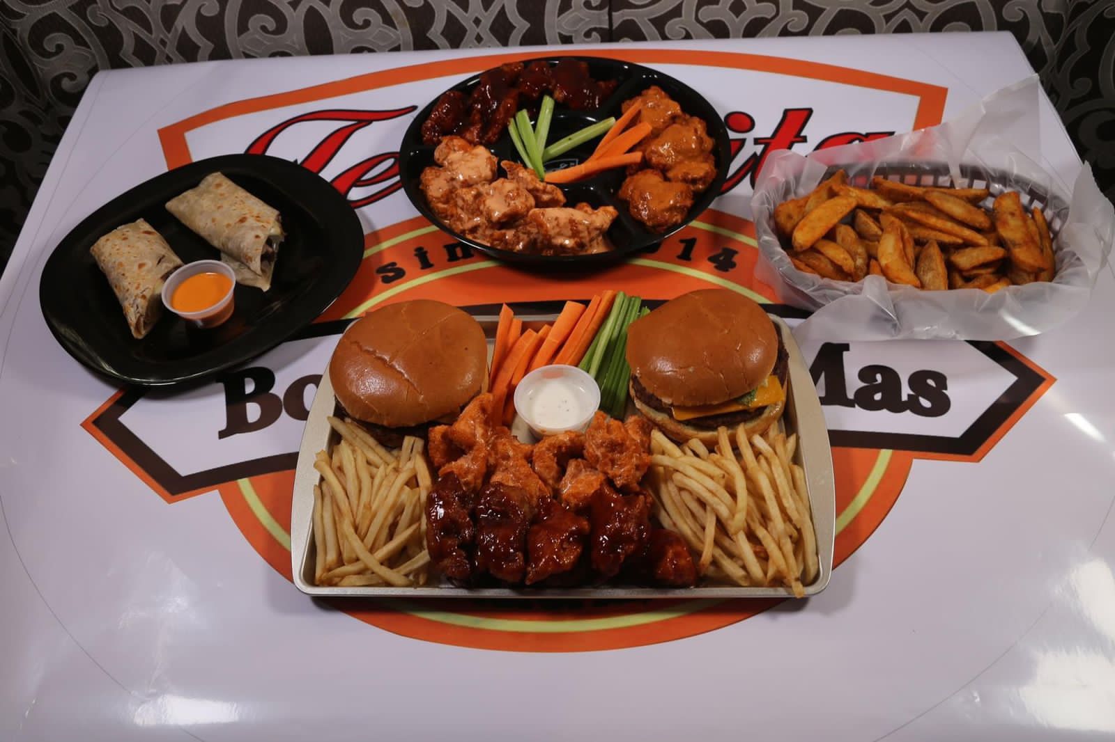 13 Jugosos boneless (3 salsas a elegir), apio, aderezo y zanahoria. 5 a 8 papas de la casa