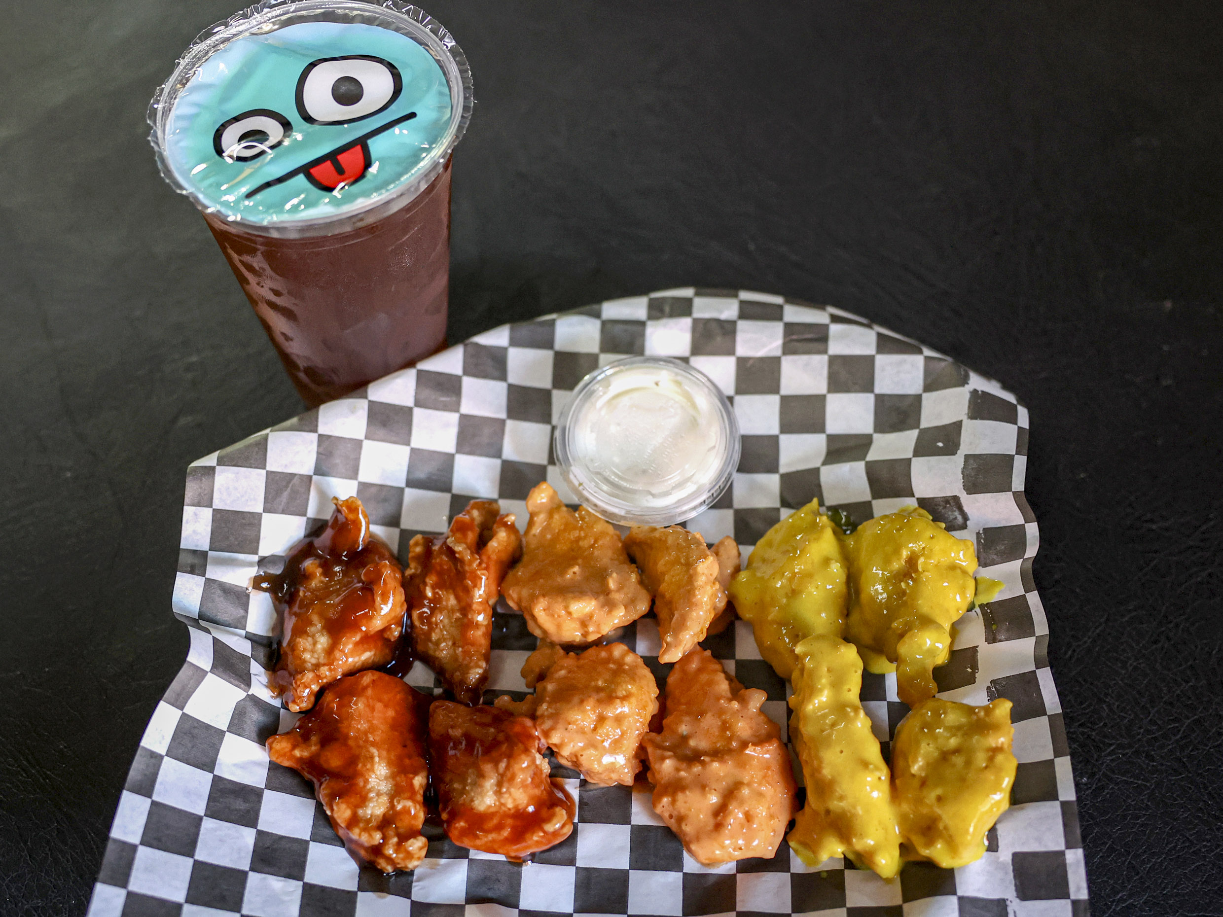 10 Jugosos boneless (2 salsas a elegir), apio, aderezo y zanahoria.