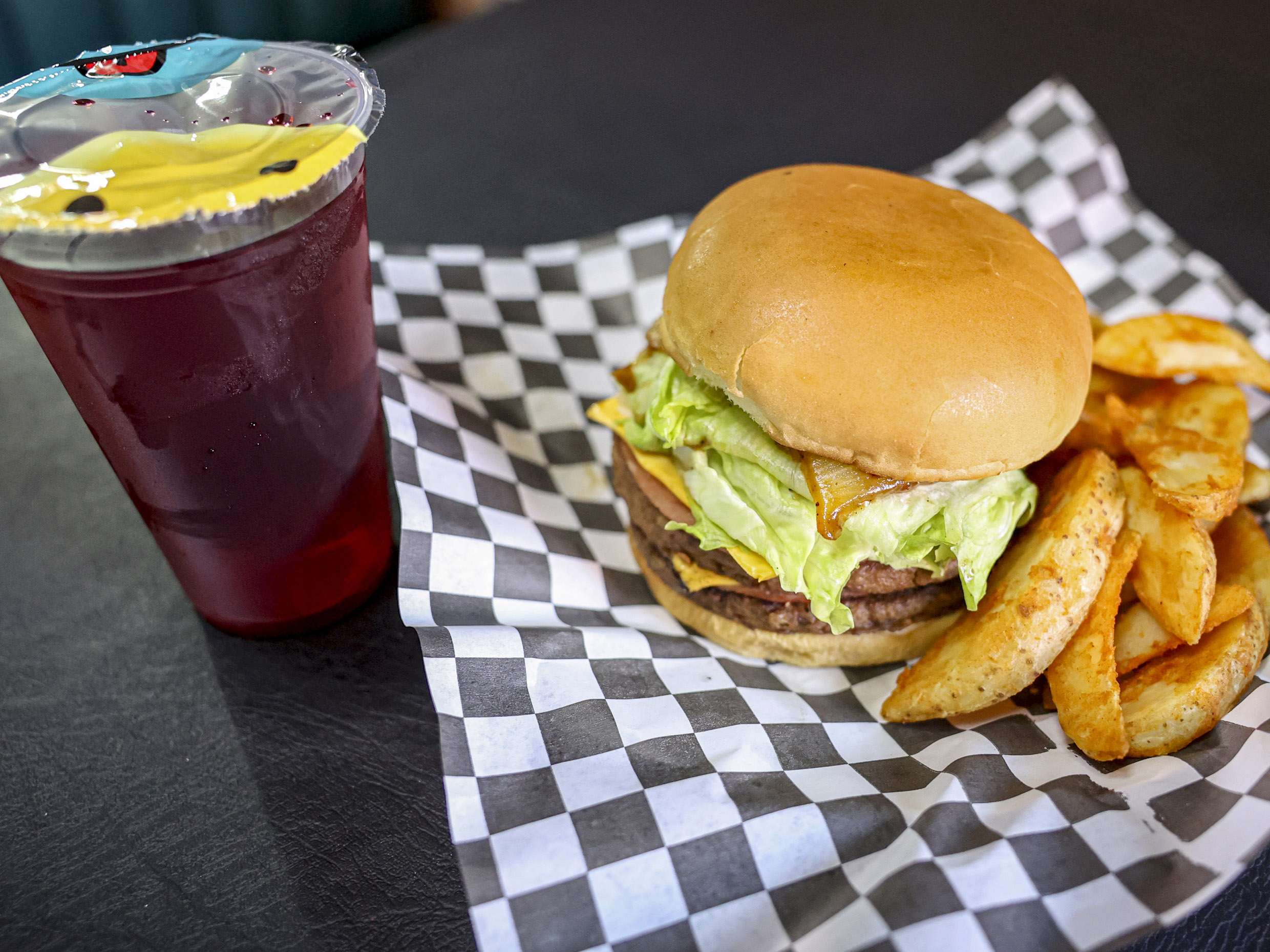 La especialidad, 300 gramos de carne, rellena de queso con todos los complementos de una hamburguesa y una orden de papas.