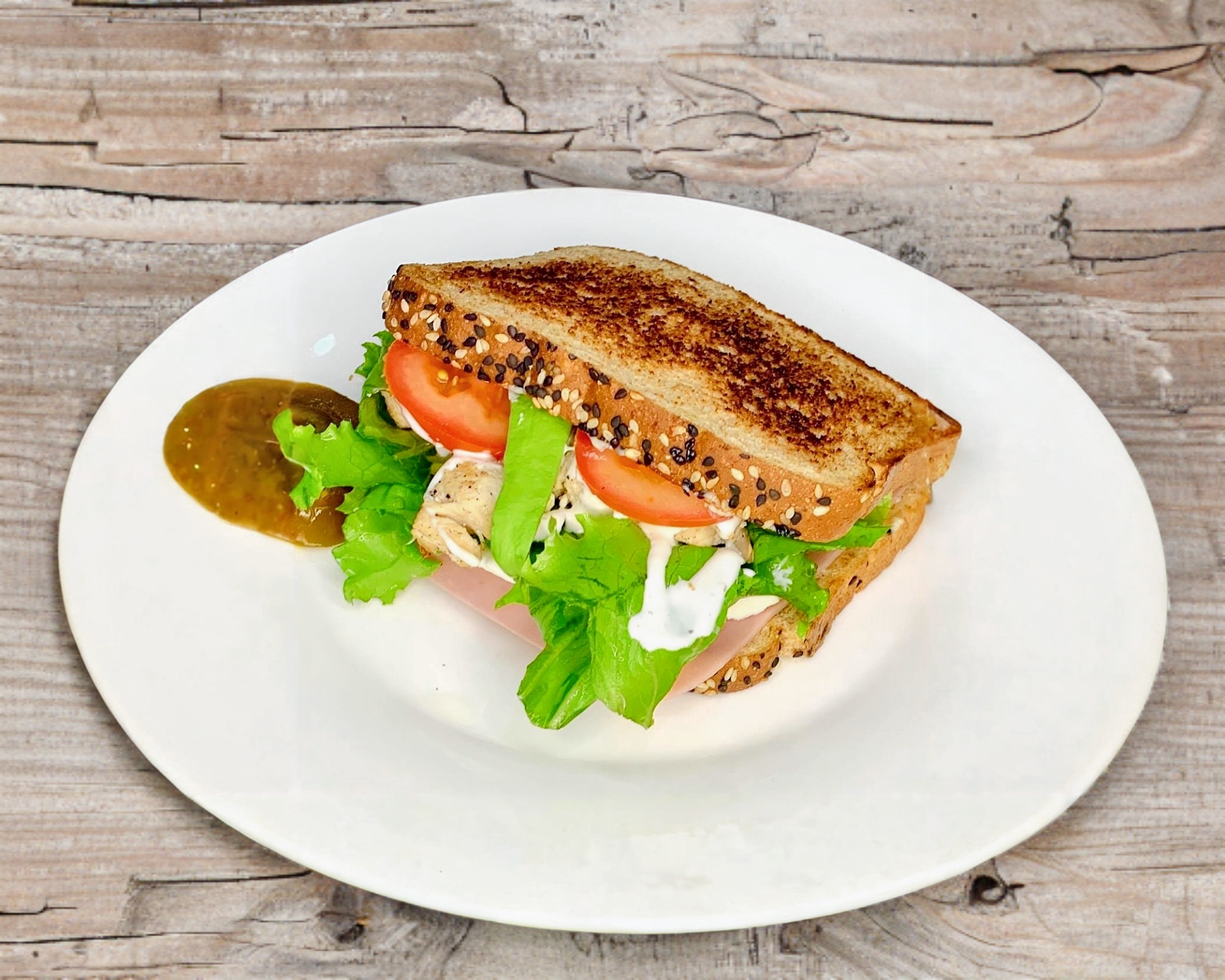 Pan multigrano con lechuga italiana, jamón, queso panela, tomate, pollo a la plancha, aguacate aderezo y jalapeños.
