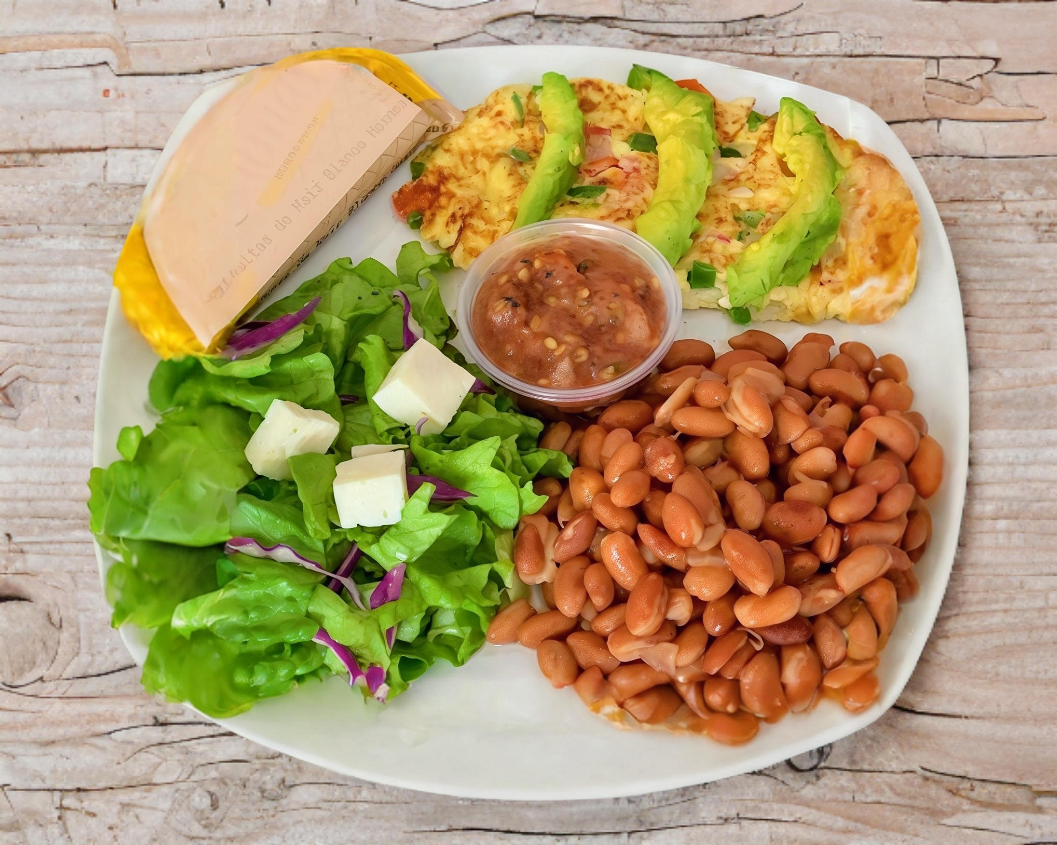 C/jamón o a la mexicana, frijoles cocidos, ensalada de lechuga italiana y panela, salsa tatemada y tostaditas horneadas.
