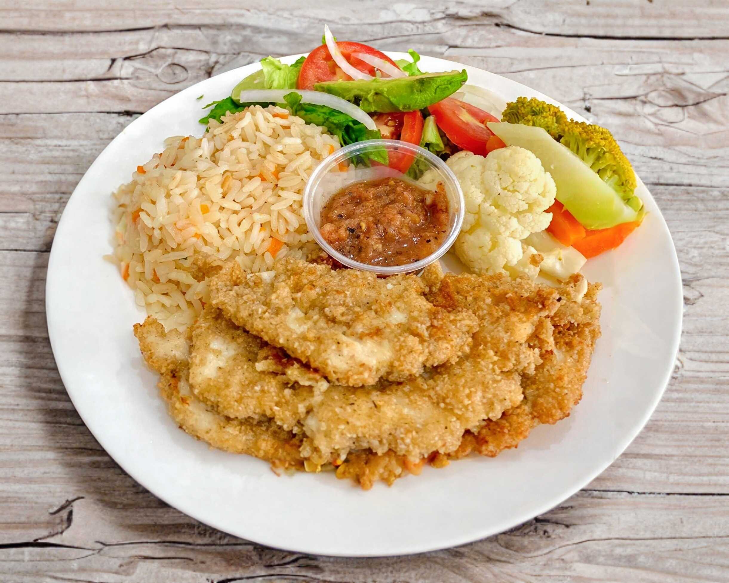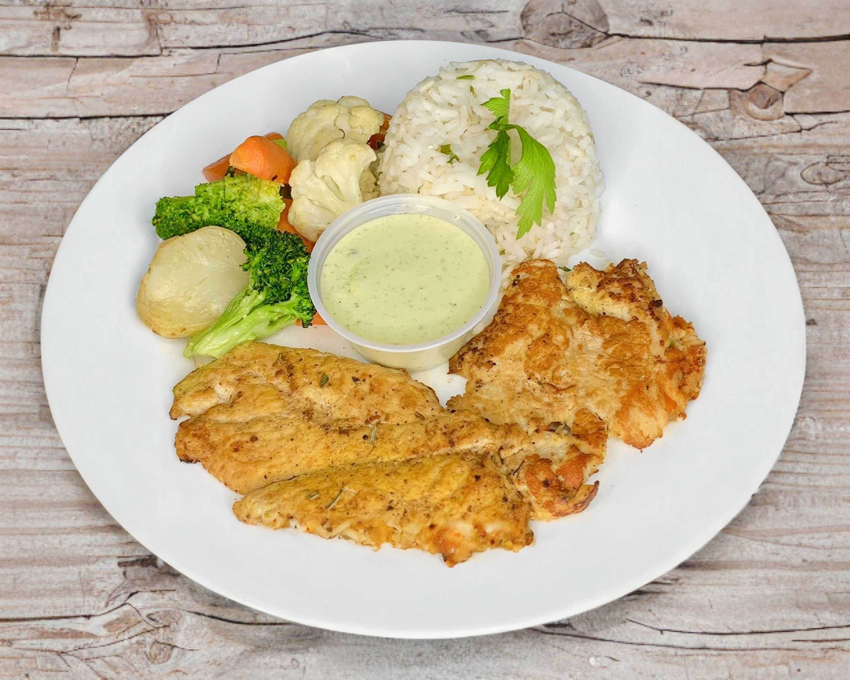 Milanesa de pollo empanizada con avena, acompañada de arroz blanco, verduras al vapor, ensalada de lechuga, aderezo/salsa de calabaza-aguacate y crema de brócoli como entrada