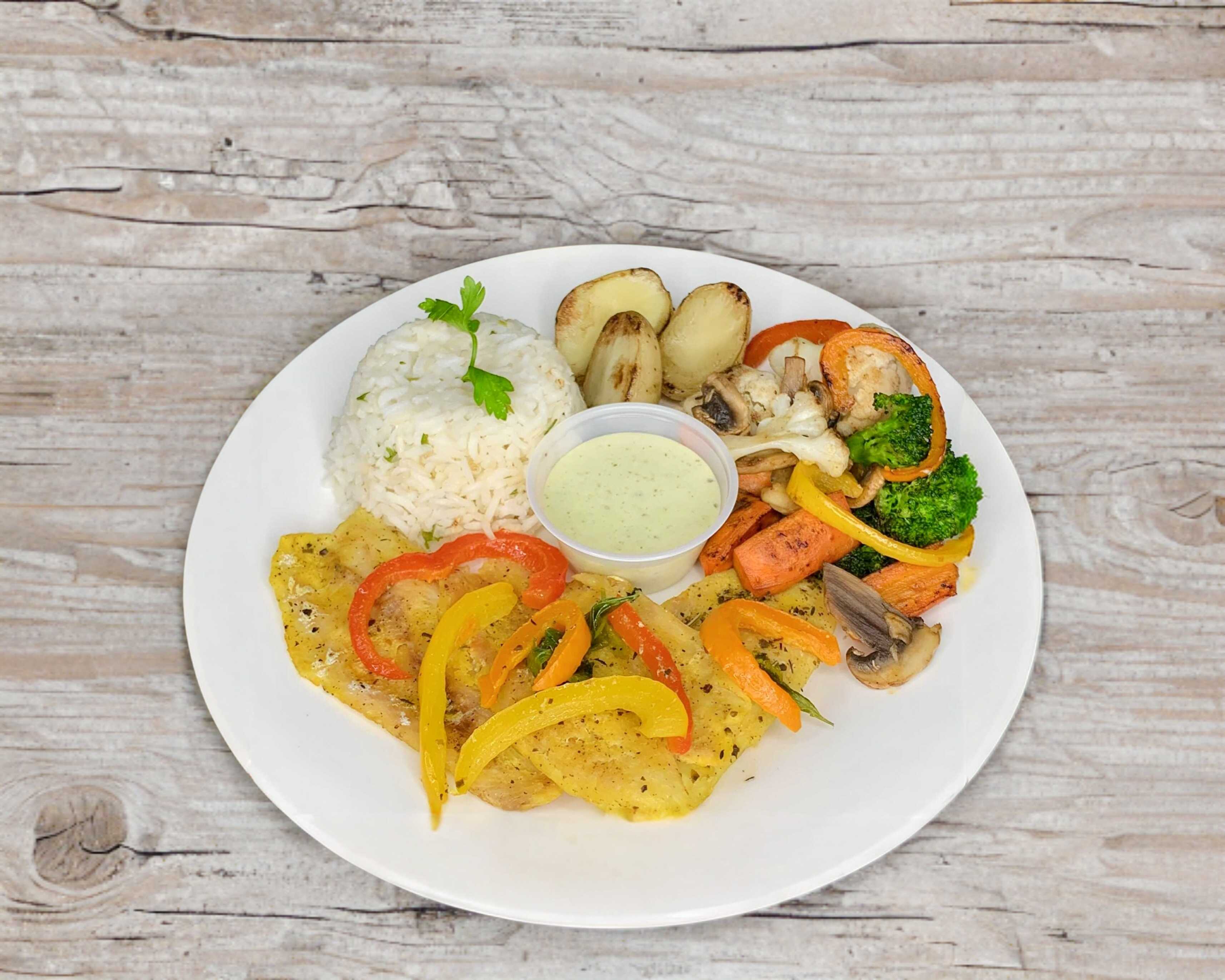 Filete de pescado a la plancha, acompañada de arroz blanco, verduras al vapor, aderezo/salsa de calabaza-aguacate y crema de brócoli como entrada.