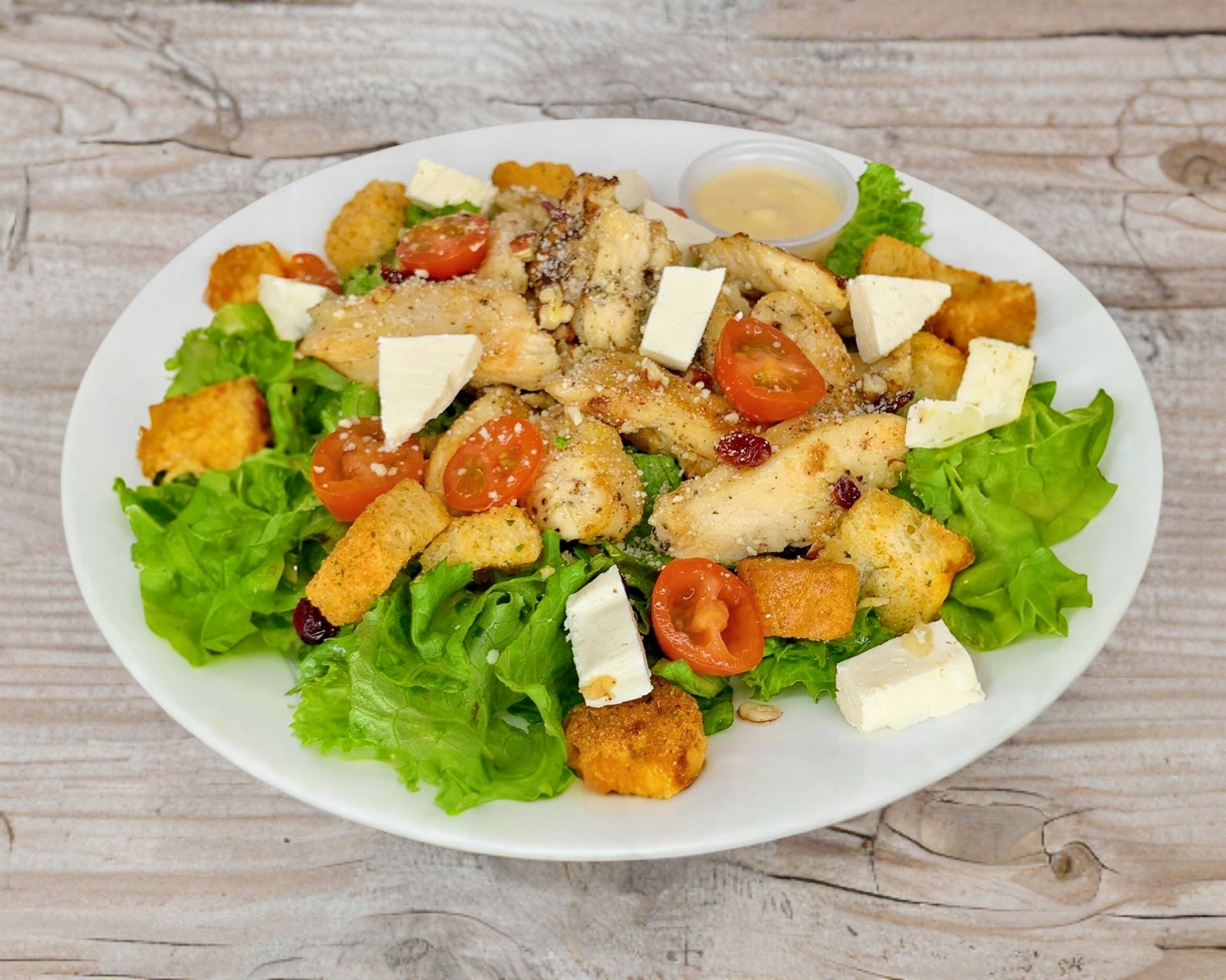 Platillo personal con pechuga de pollo a la plancha, cama de lechuga italiana, crotones, panela, tomate cherry, aderezo (césar o ranch), nuez, arándanos, toque de aceite de oliva y queso parmesano por aparte.