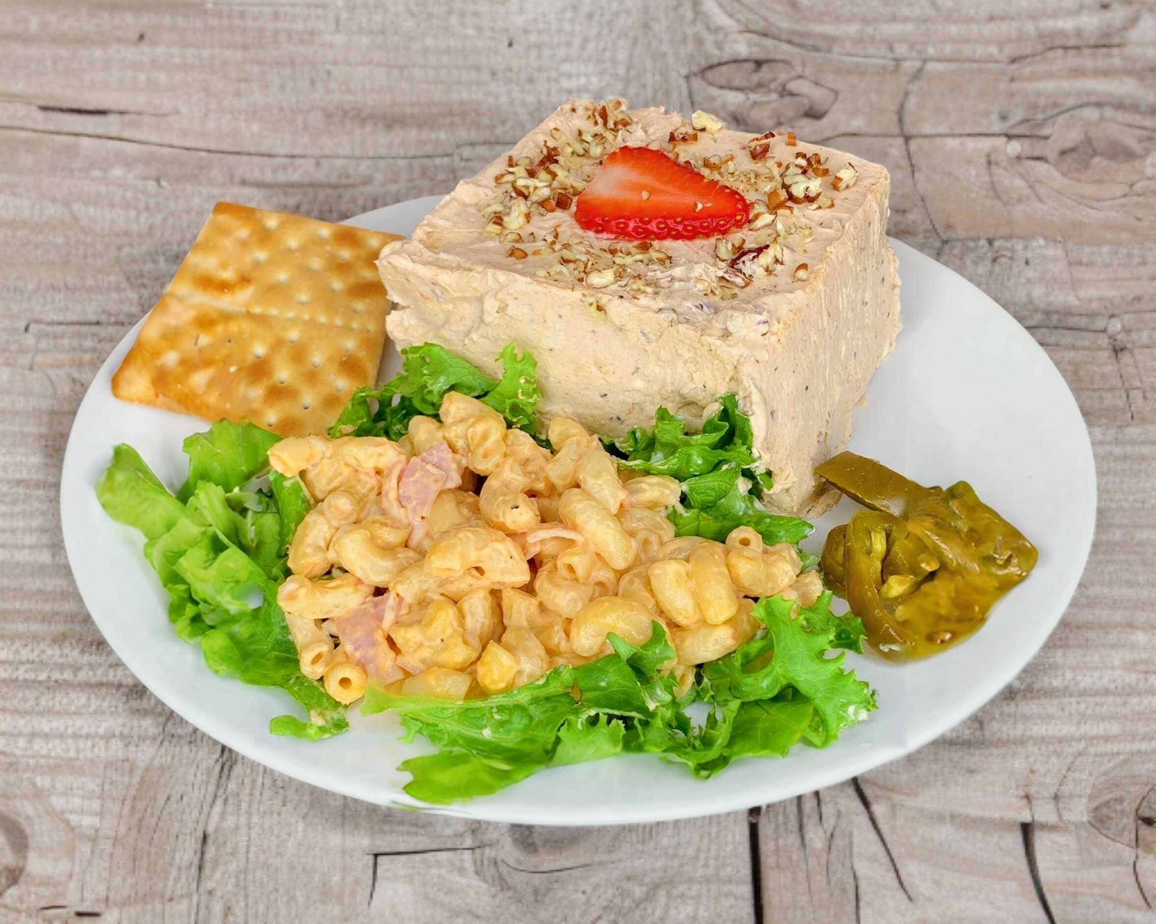 Ensalada personal de pollo con ensalada de coditos, cama de lechuga, galletas y jalapeños.