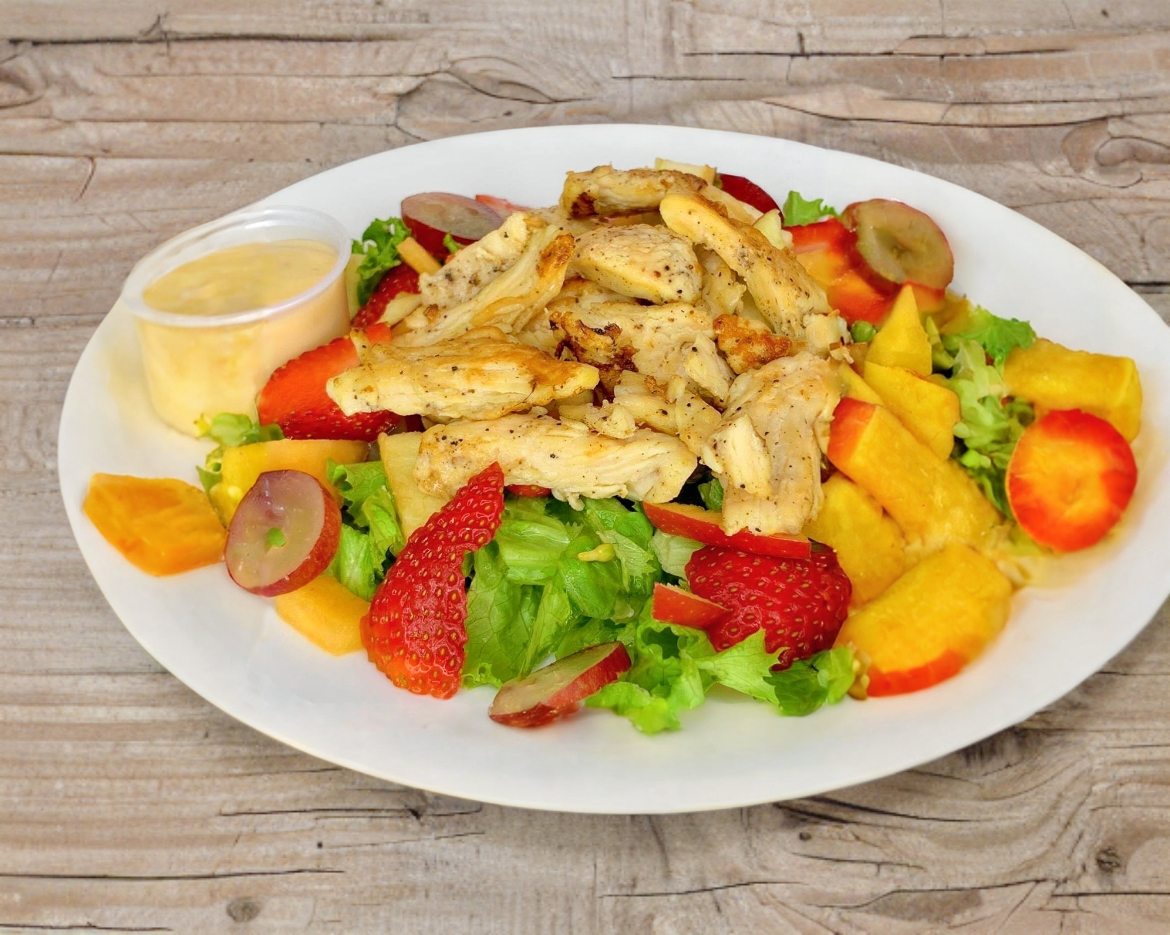 Ensalada Frutal (lechuga italiana con trozos de fresa manzana, uva, mango, nuez ó frutas similares de temporada) pollo a la plancha y toque de aceite de oliva.