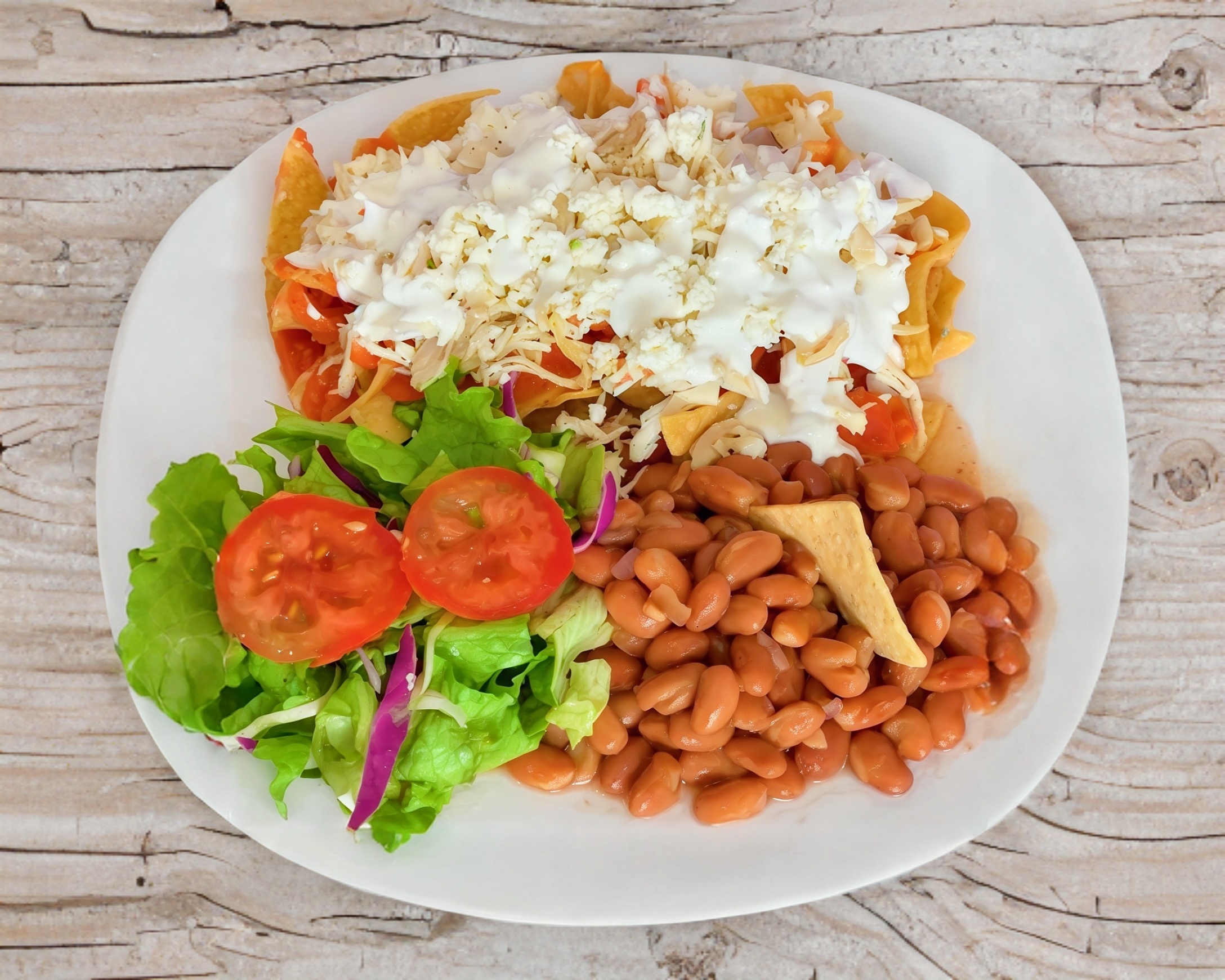 Rojos o verdes, pechuga de pollo, crema, frijoles cocidos, ensalada de lechuga italiana y tomate y salsa tatemada.