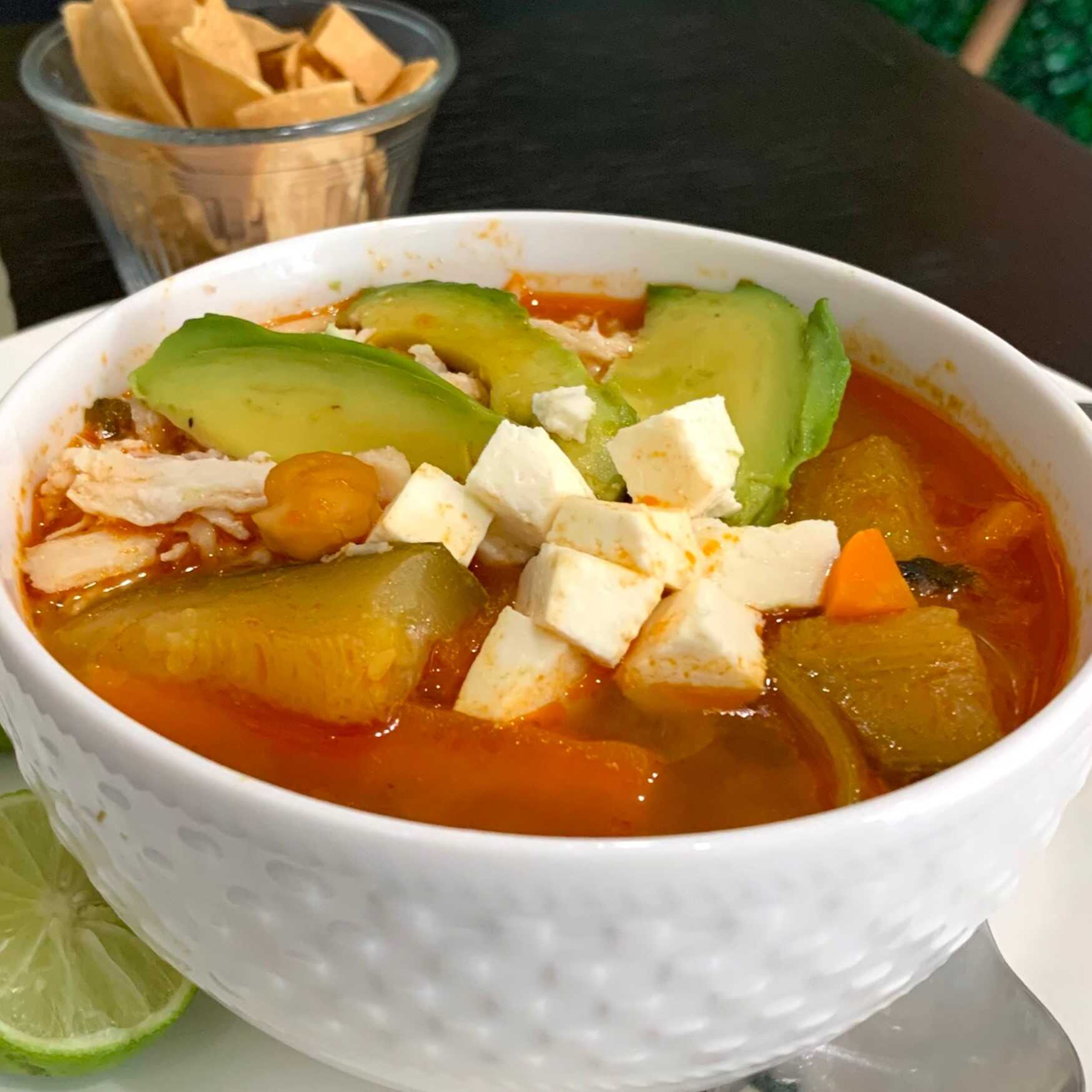 Medio litro de caldo (pollo, aguacate, queso panela) tlalpeño acompañado de tiras de maíz