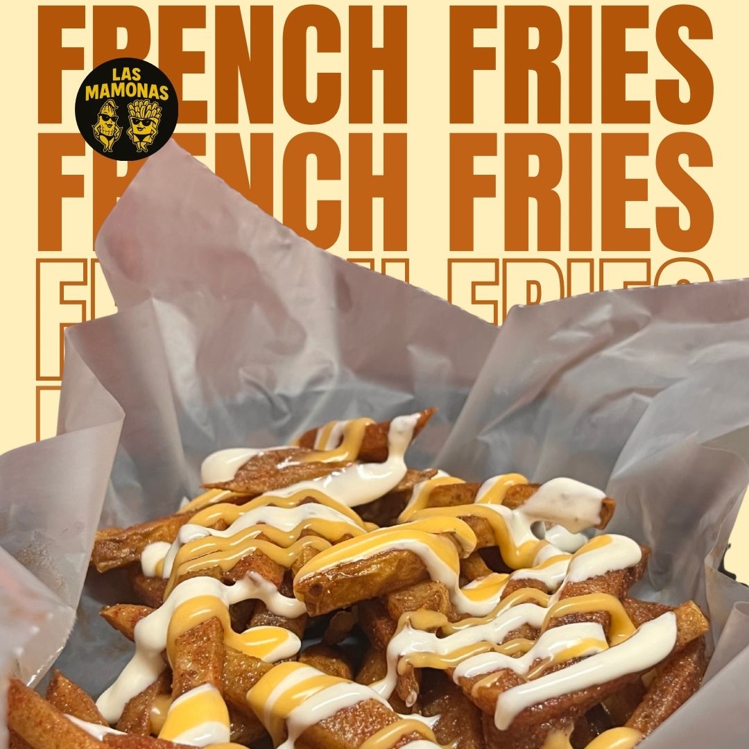 Salchichas en forma de pulpito con papas a la francesa acompañados de queso cheddar y ranch.