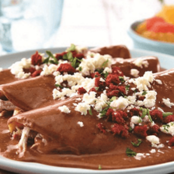 Orden de 4 enfrijoladas de tortilla de maiz recien hecha, rellenas de queso y bañadas en salsa de frijol, acompañadas de lechuga fresca y espolvoreado con queso fresco y chorizo