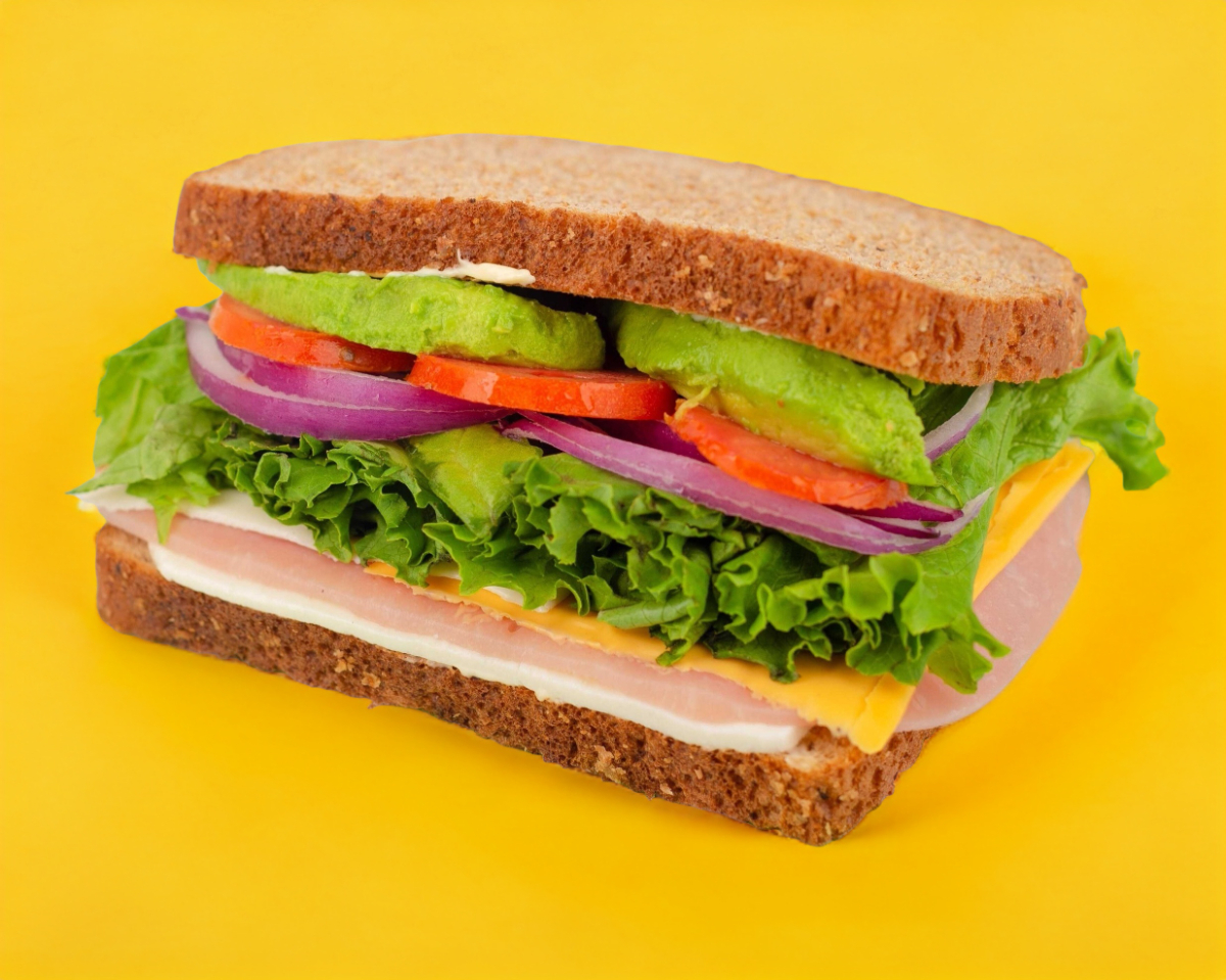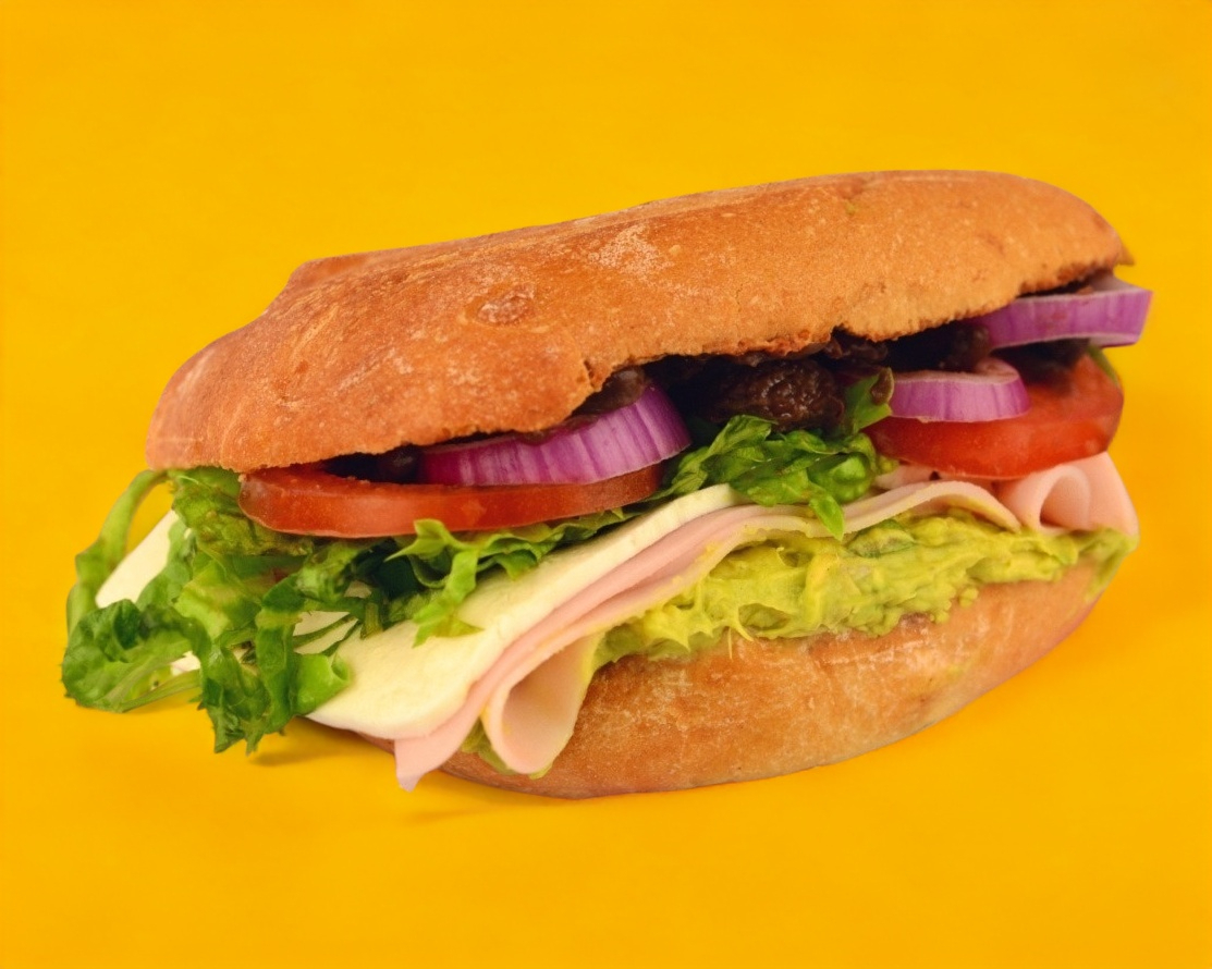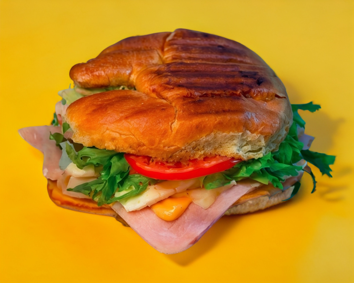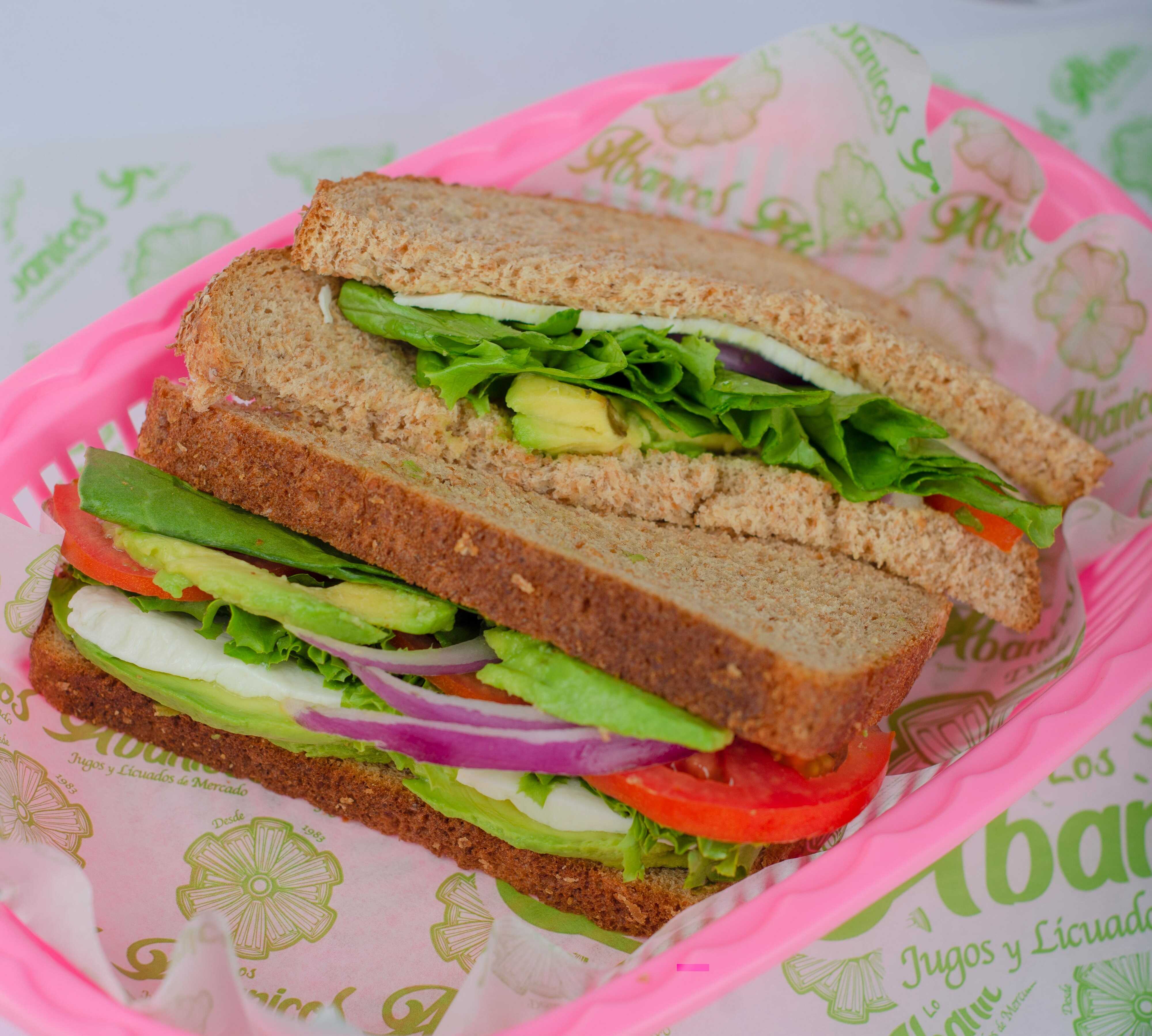 Cuernito recién horneado con queso manchego, amarillo y panela, Lechuga, tomate, complemento con chile jalapeño y aderezo de chipotle de la casa.